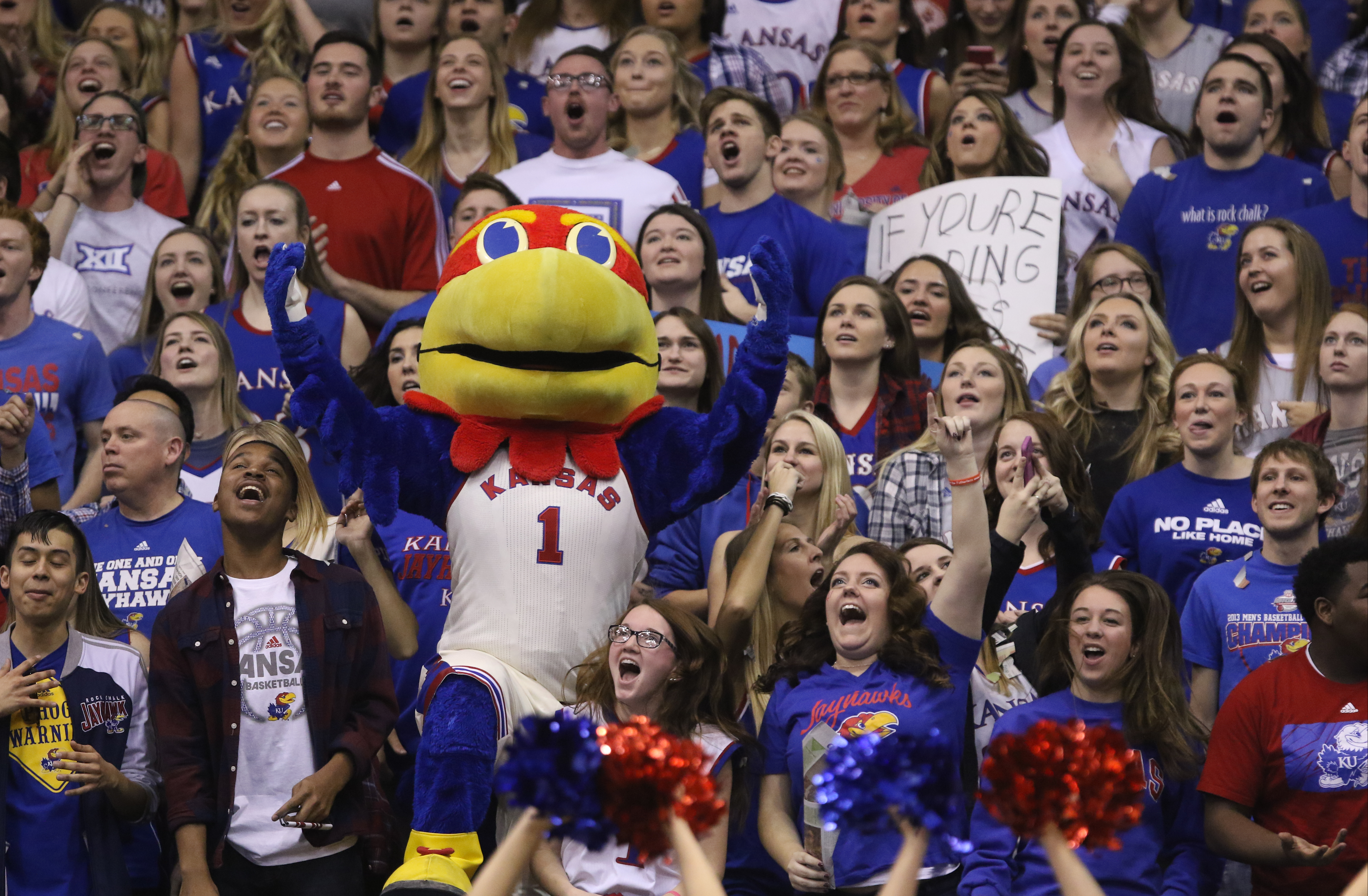 Big Jay rallies the students in the north end zone, Saturday, Feb. 27, 2016 at Allen Fieldhouse.