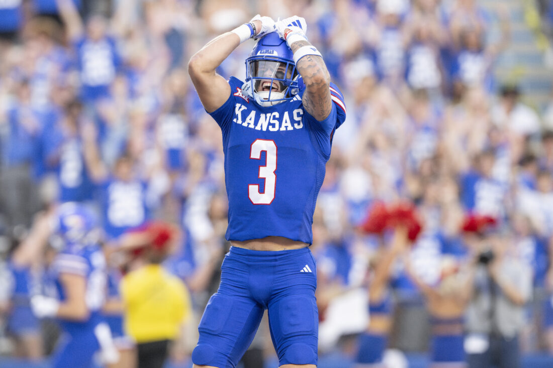 Kansas sophomore Keaton Kubecka celebrates scoring a touchdown against Fresno State at David Booth Kansas Memorial Stadium Saturday, Aug. 23, 2025 in Lawrence.