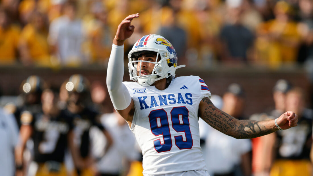 Kansas place kicker Laith Marjan (99) during an NCAA college football game on Saturday, Sept. 6, 2025, in Columbia, Mo.