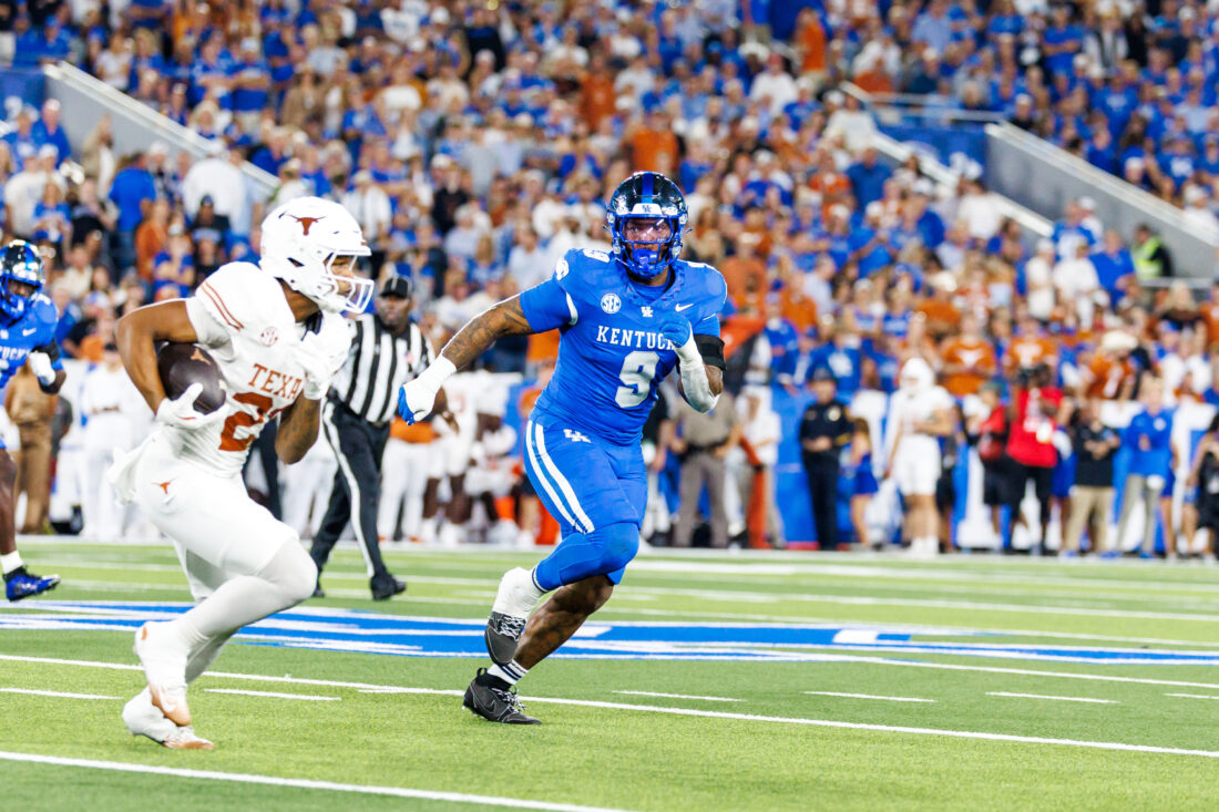 Kentucky linebacker Landyn Watson looks to make a tackle against Texas on Saturday, Oct. 18, 2025, in Lexington, Ky.