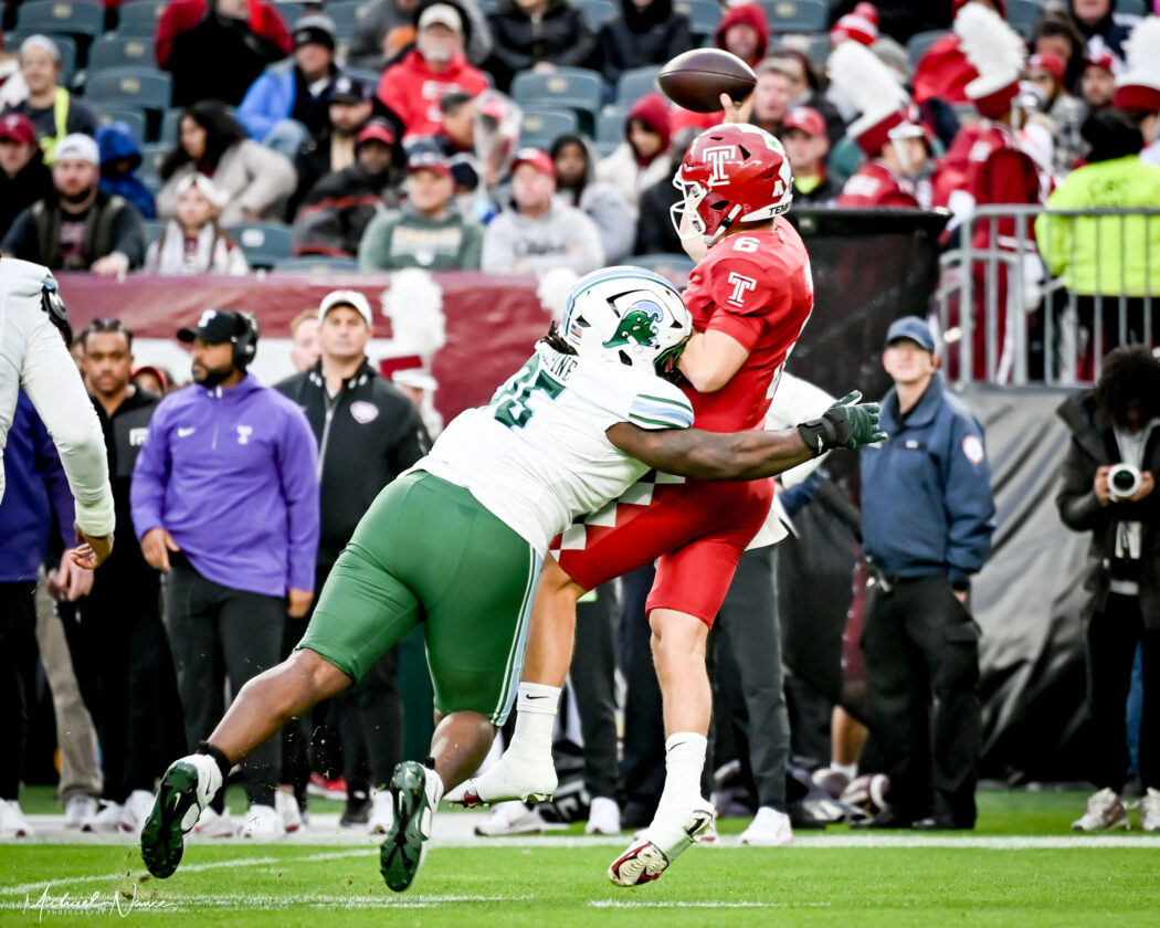 Tulane defensive tackle Tre’Von McAlpine hits Temple quarterback Evan Simon on Saturday, Nov. 22, 2025, in Philadelphia.