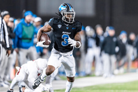 Buffalo wide receiver Nik McMillan breaks free against Miami (Ohio) on Wednesday, Nov. 19, 2025, in Buffalo, N.Y.