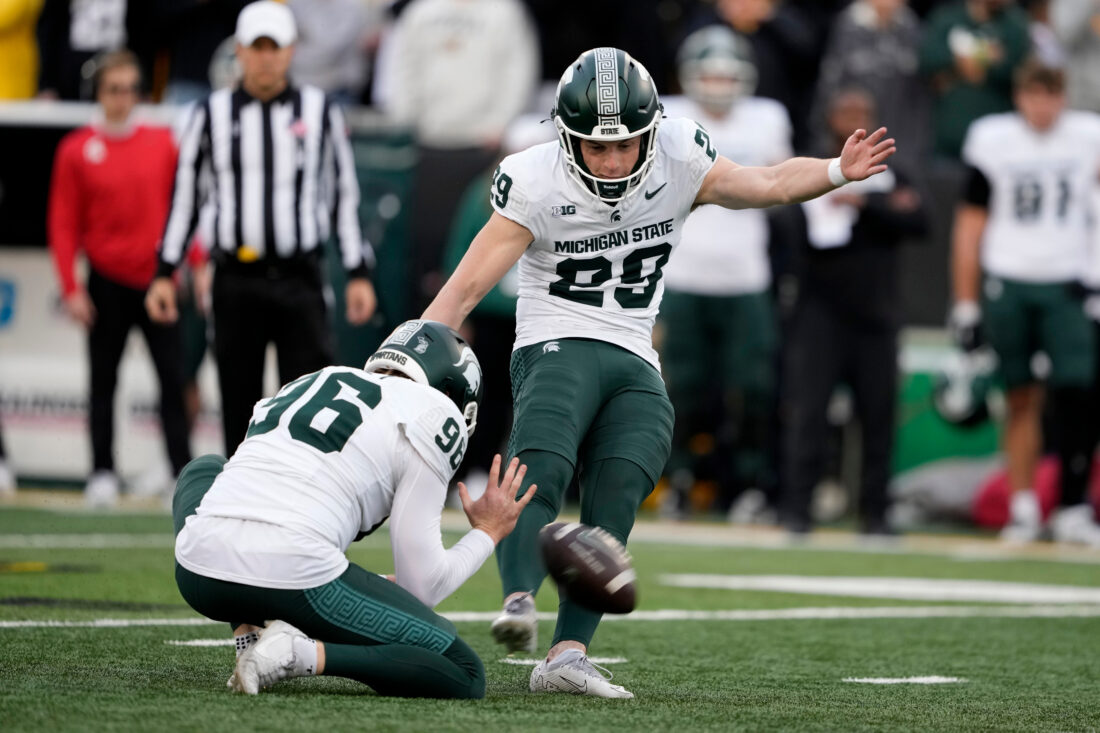 Michigan State kicker Martin Connington (29) kicks a field goal during the first half of an NCAA college football game against Iowa, Saturday, Nov. 22, 2025, in Iowa City, Iowa.