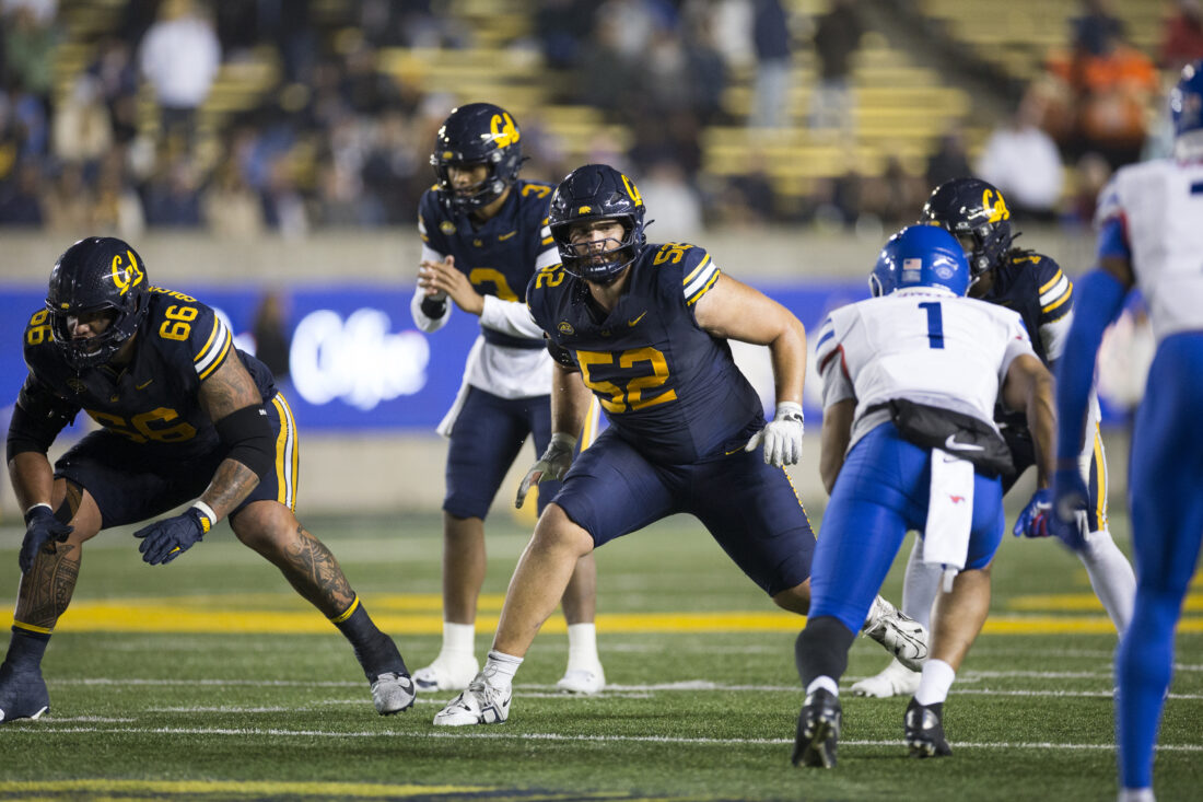 Cal offensive tackle Nick Morrow (52) gets ready to block during a game against SMU on Saturday, Nov. 29, 2025, in Berkeley, Calif.