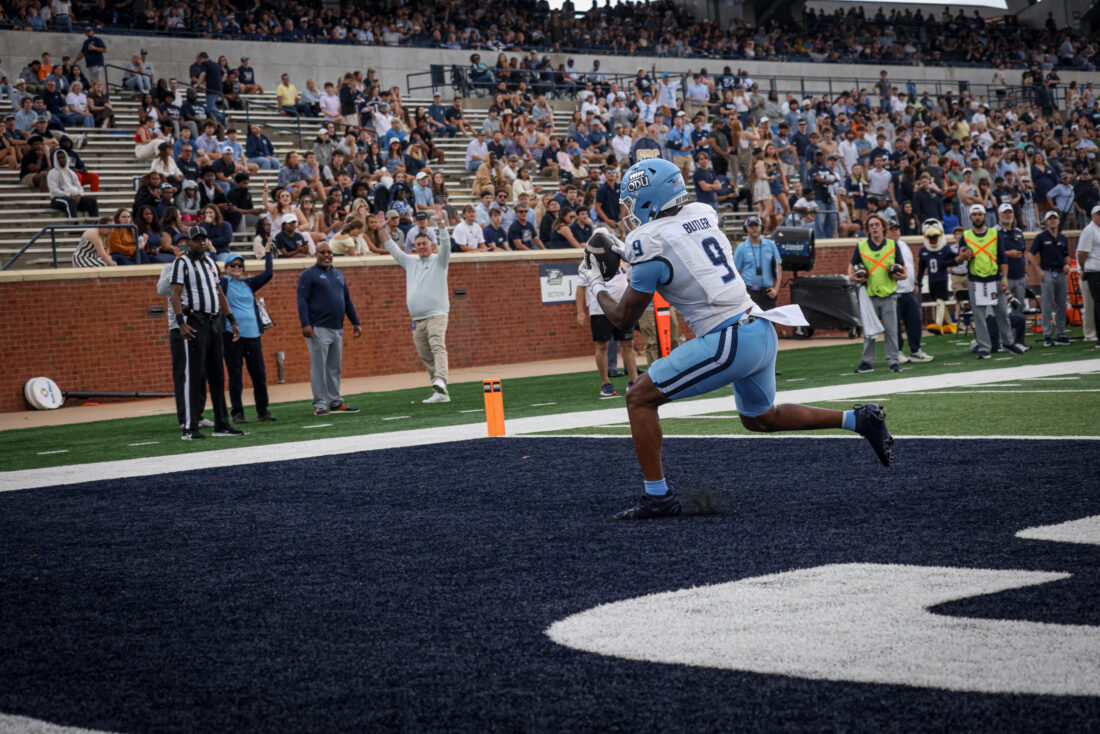 Old Dominion’s Jailen Butler catches a touchdown pass against Georgia Southern on Saturday, Nov. 22, 2025, in Statesboro, Ga.
