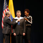 Chancellor Douglas Girod and former chancellor Bernadette Gray-Little perform the hooding ceremony on Colombian President Juan Manuel Santos at the Lied Center on Tuesday, Oct. 31, 2017. Santos graduated from the University of Kansas in 1973, and on Tuesday was presented an honorary Doctor of Humane Letters degree for outstanding contributions to achieving peace in his country and the world.