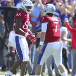 Kansas wide receiver Jeremiah Booker (88) slaps hands with Kansas quarterback Peyton Bender (7) after a touchdown during the second quarter on Saturday, Oct. 7, 2017 at Memorial Stadium.