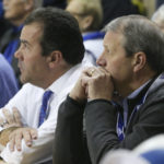 In this file photo from Nov. 8, 2017, University of Kansas Chancellor Douglas Girod, right, and KU athletic director Sheahon Zenger watch the action from the sideline at a KU volleyball game.