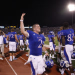 Kansas quarterback Jordan Webb motions to the Memorial Stadium crowd after connecting with receiver D.J. Beshears for a touchdown late in the fourth quarter on Saturday, Sept. 10, 2011 at Kivisto Field.