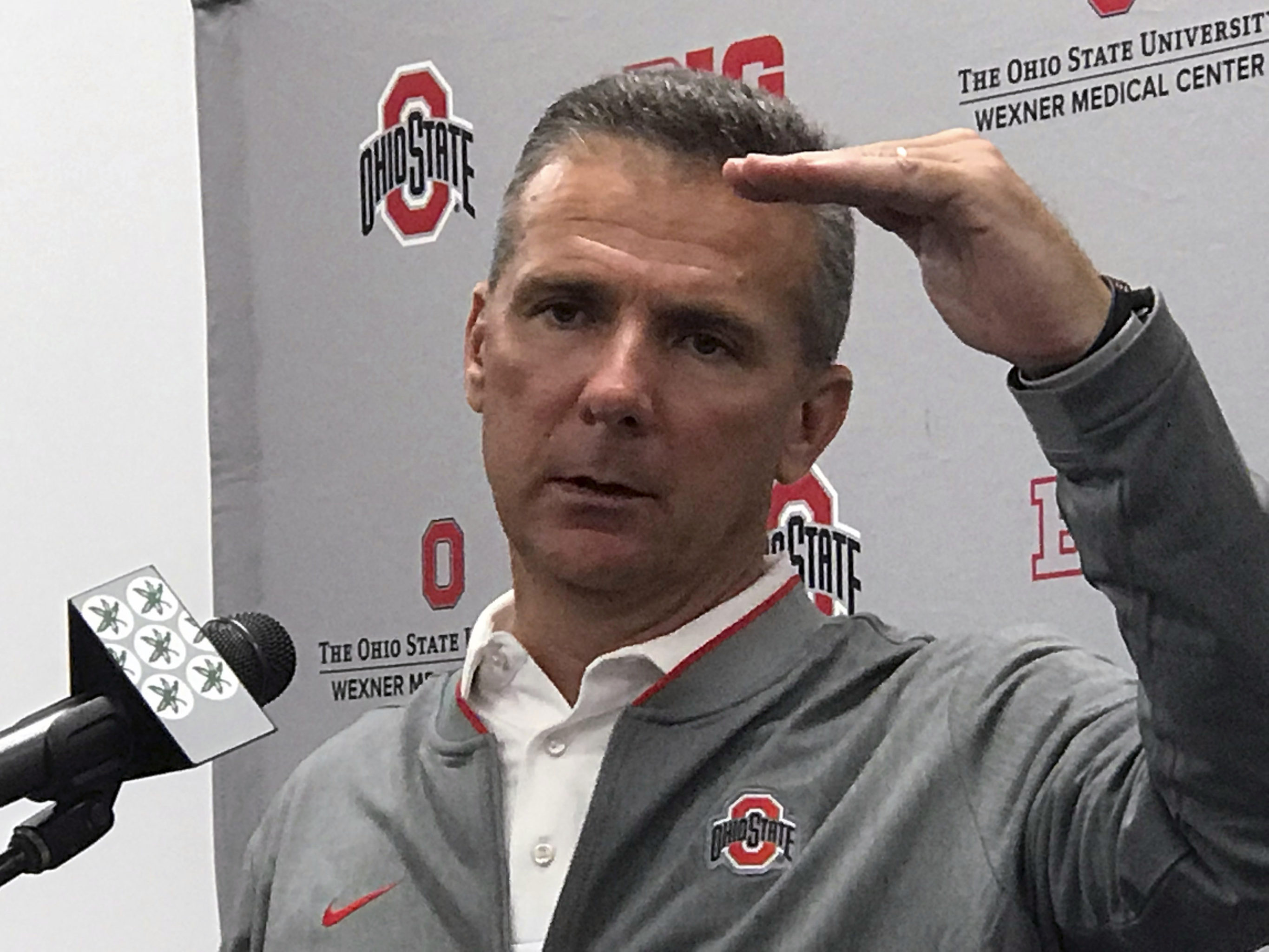 Ohio State NCAA college football head coach Urban Meyer gestures while speaking at a press conference in Columbus, Ohio, Monday, Sept. 17, 2018. (AP Photo/Mitch Stacy)