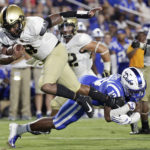 Duke's Marquis Waters (10) tackles Army quarterback Kelvin Hopkins Jr. (8) during the second half of an NCAA college football game in Durham, N.C., Friday, Aug. 31, 2018. Duke won 34-14. (AP Photo/Gerry Broome)