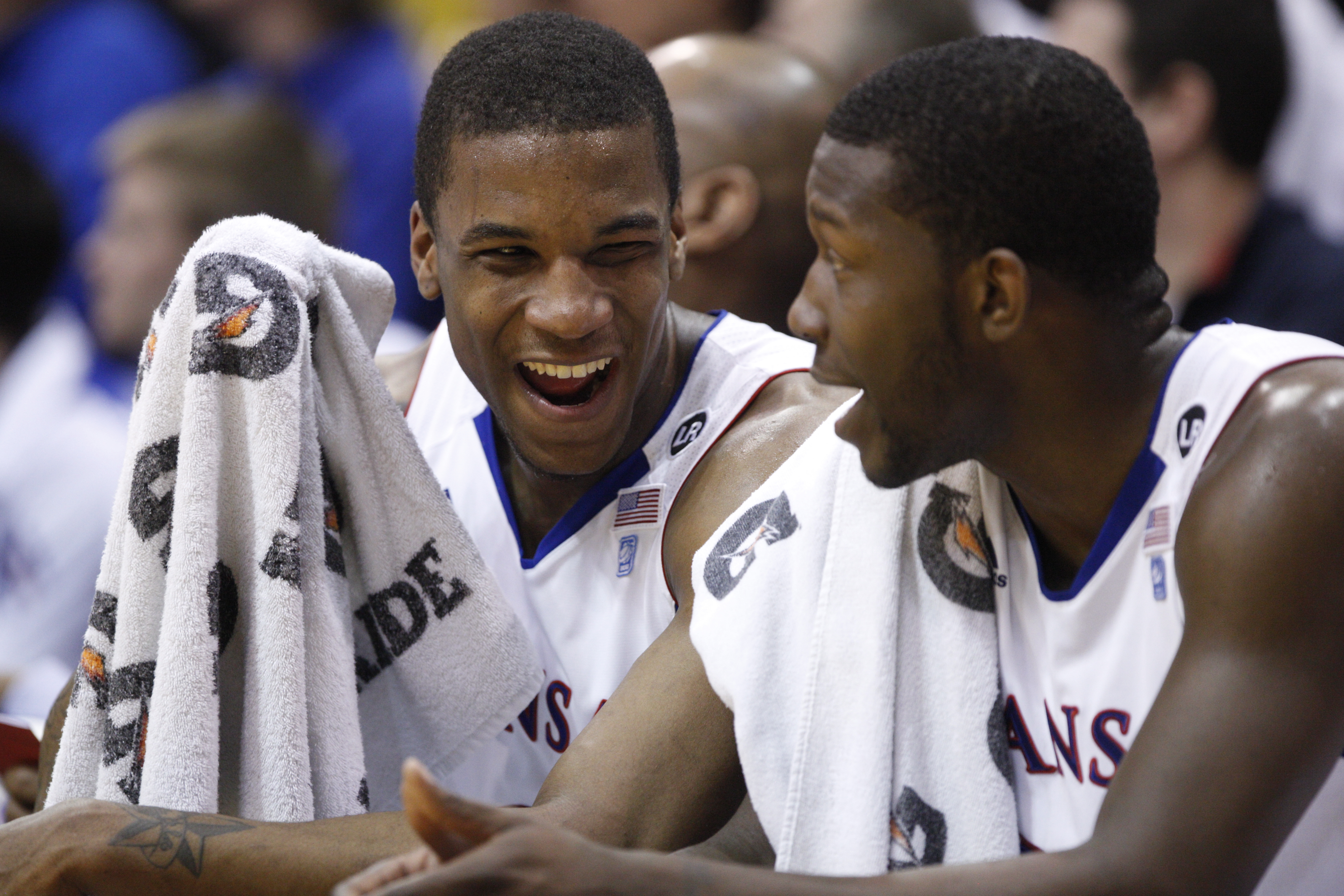 Kansas teammates Thomas Robinson, left, and Mario Little laugh on the bench late in the second half against Missouri on Monday, Feb. 7, 2011 at Allen Fieldhouse.