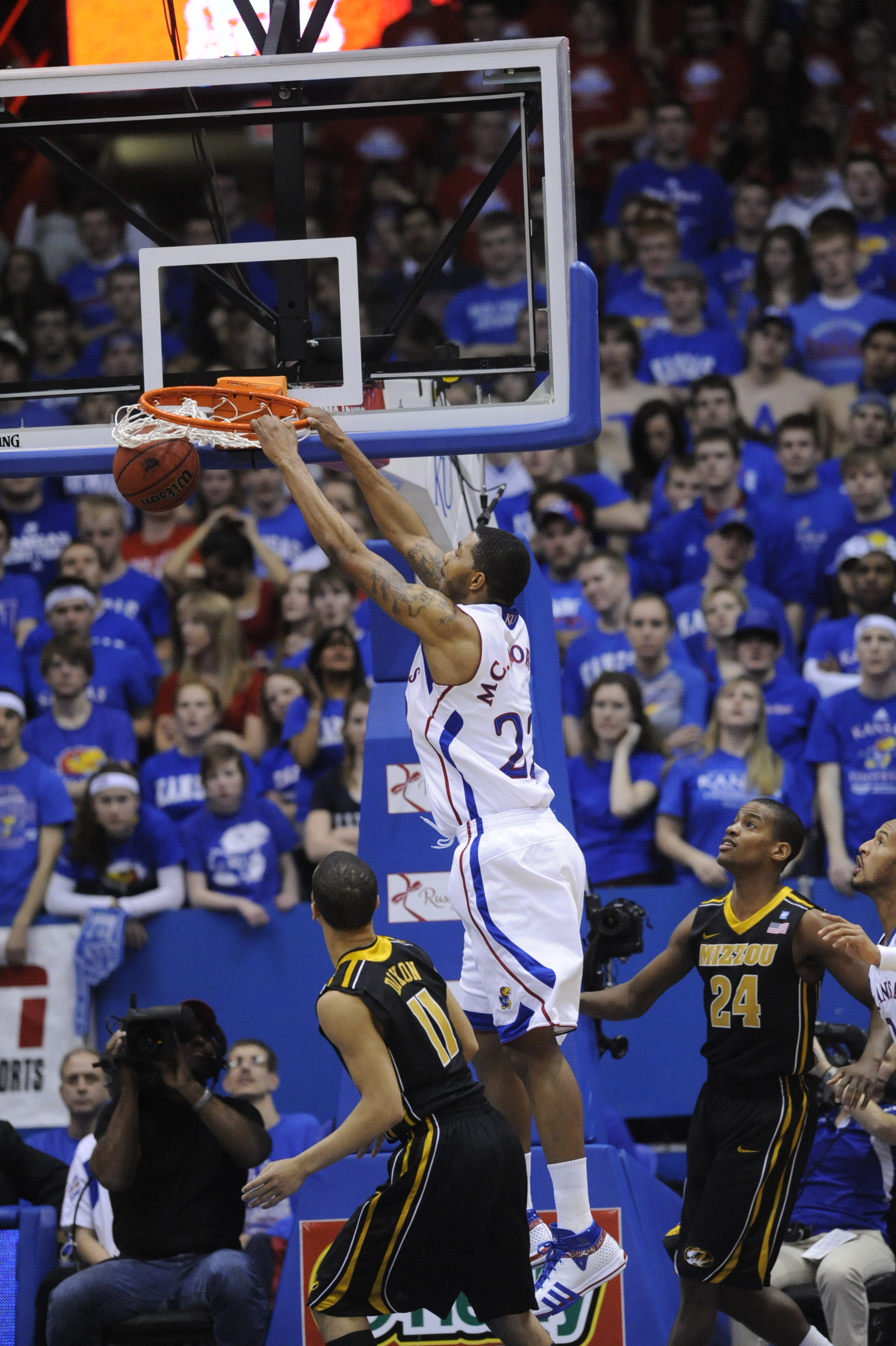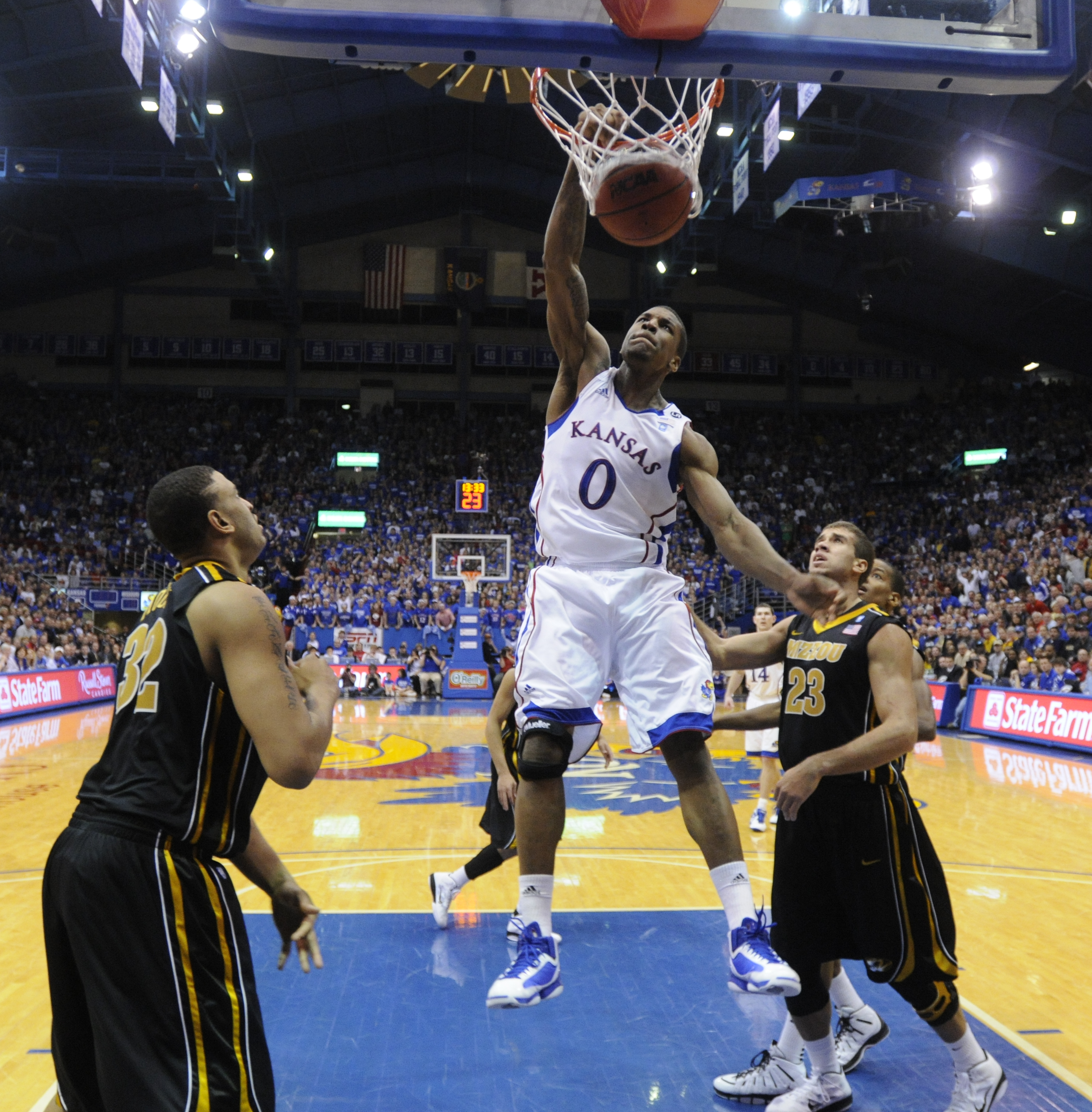 Kansas forward Thomas Robinson delivers a tomahawk jam between Missouri defenders Steve Moore, left, and Justin Safford during the second half on Monday, Feb. 7, 2011 at Allen Fieldhouse.