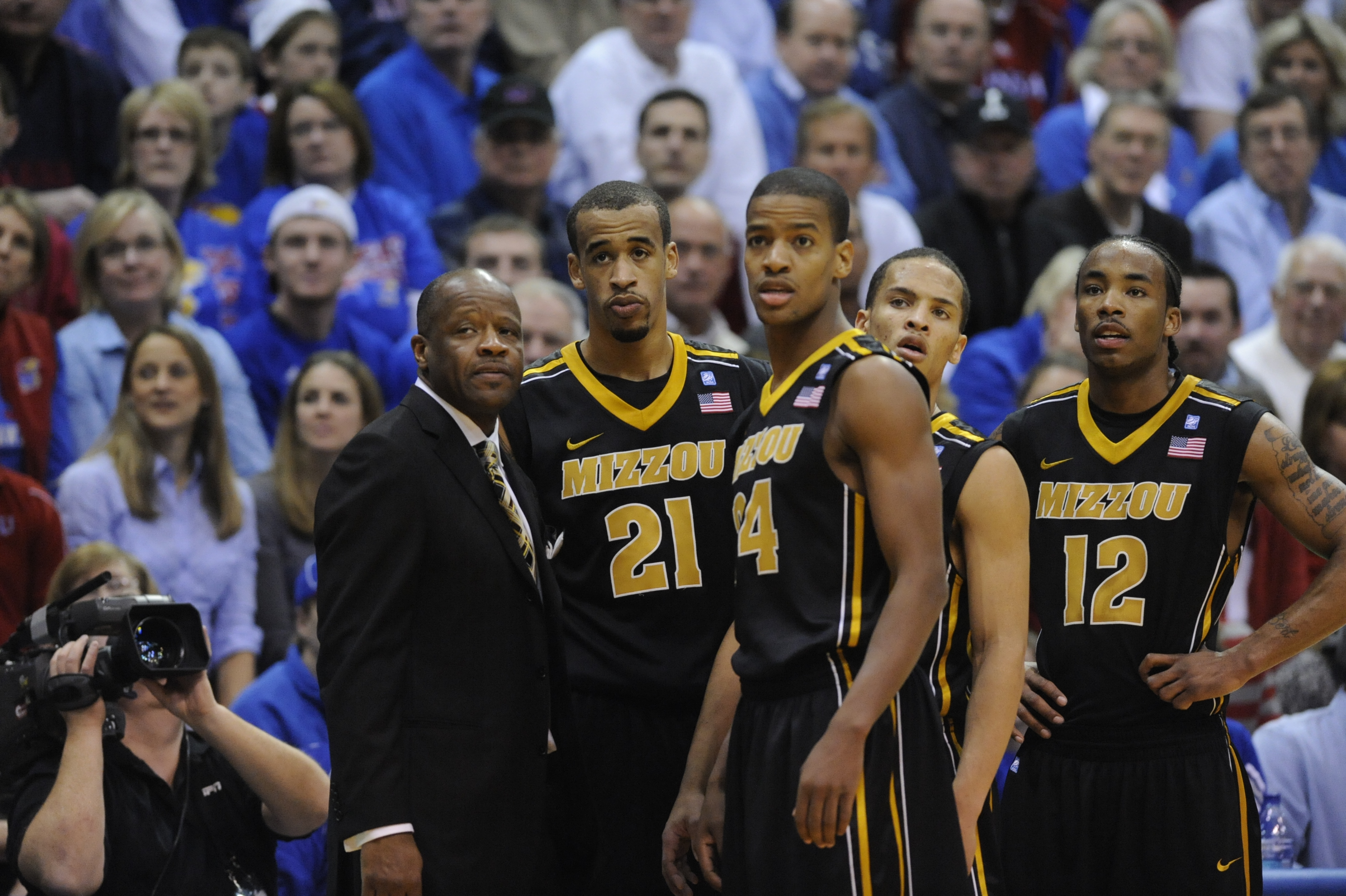 Missouri coach Mike Anderson, left, and players huddle up in the second half against Kansas on Monday, February 7, 2011 at Allen Fieldhouse.