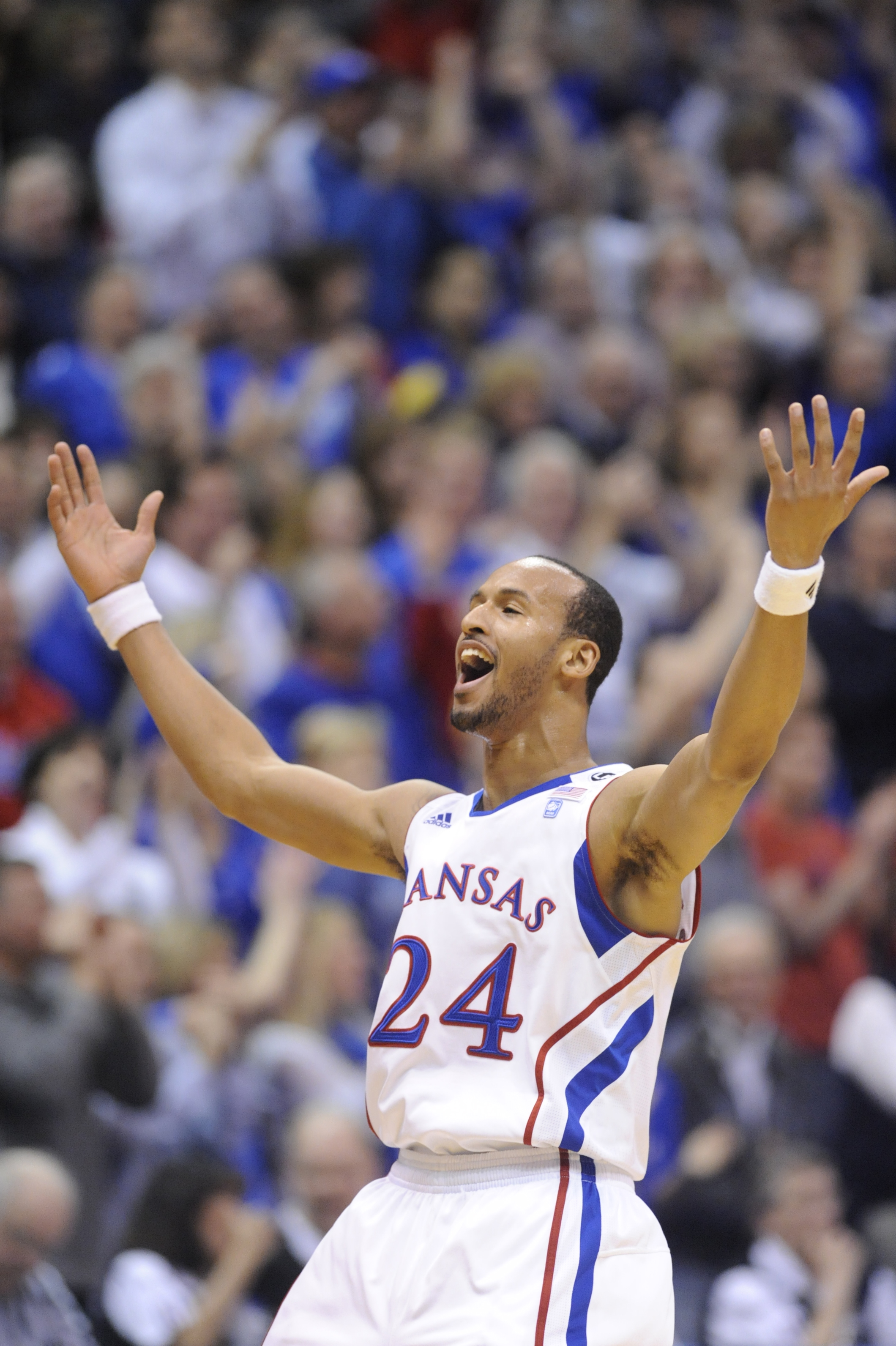 Kansas guard Travis Releford gets the crowd to its feet after scoring a basket against Missouri on Monday, February 7, 2011 at Allen Fieldhouse.