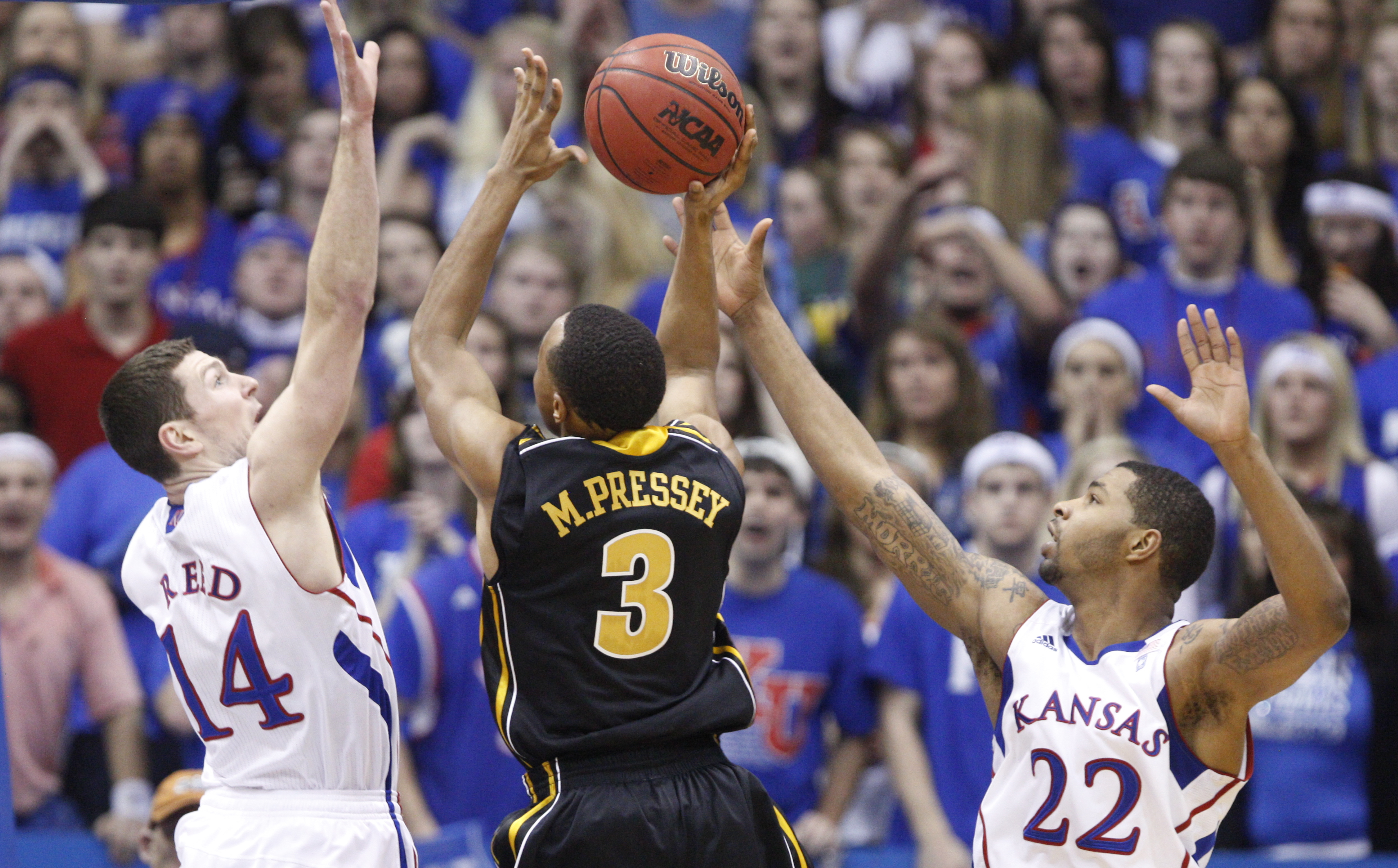 Kansas defenders Tyrel Reed and Marcus Morris defend a shot by Missouri guard Matt Pressey during the second half on Monday, Feb. 7, 2011 at Allen Fieldhouse.