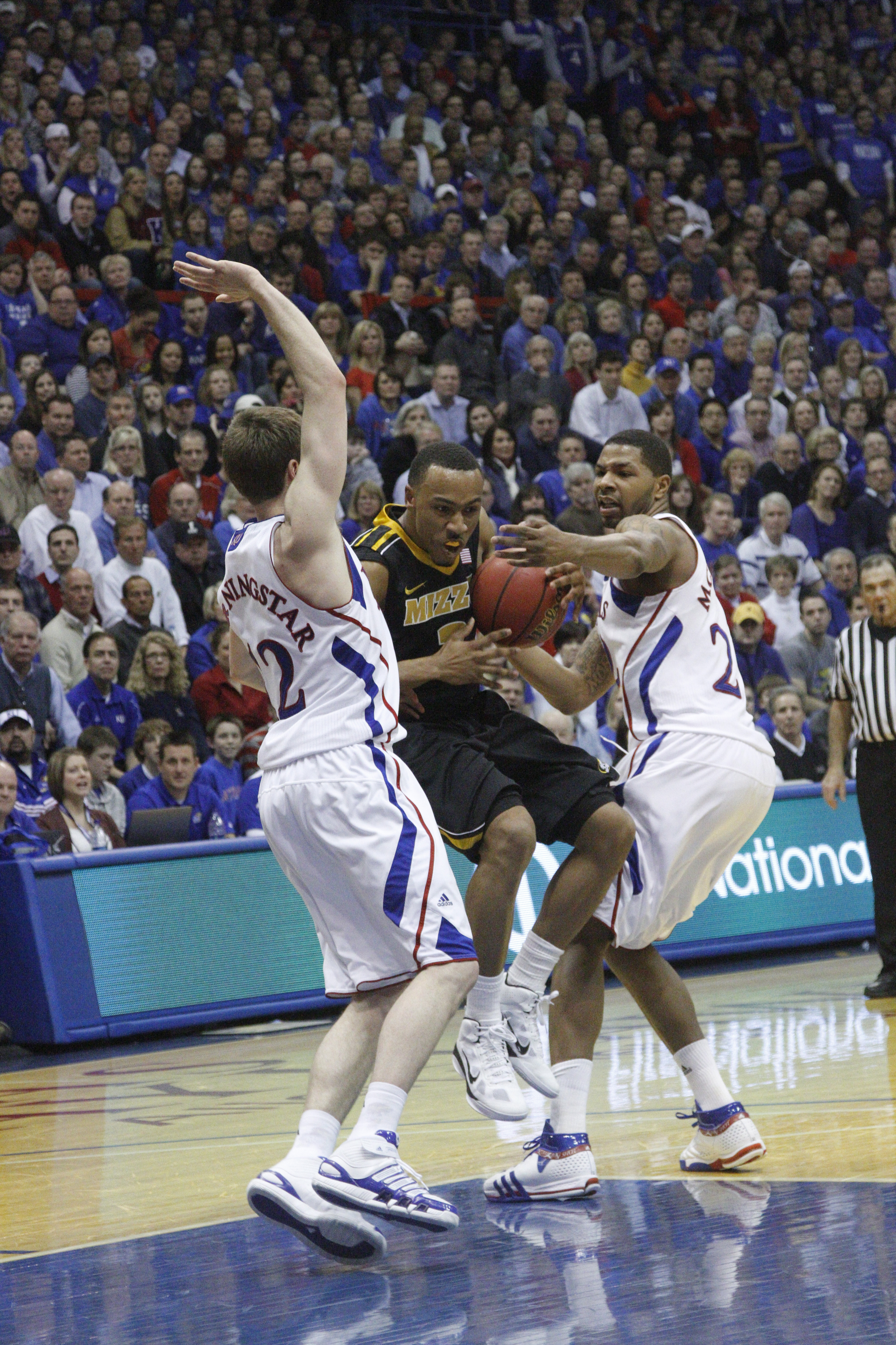 Kansas players Brady Morningstar (12) and Marcus Morris (22) defend Missouri's Phil Pressey on Monday, February 7, 2011 at Allen Fieldhouse.