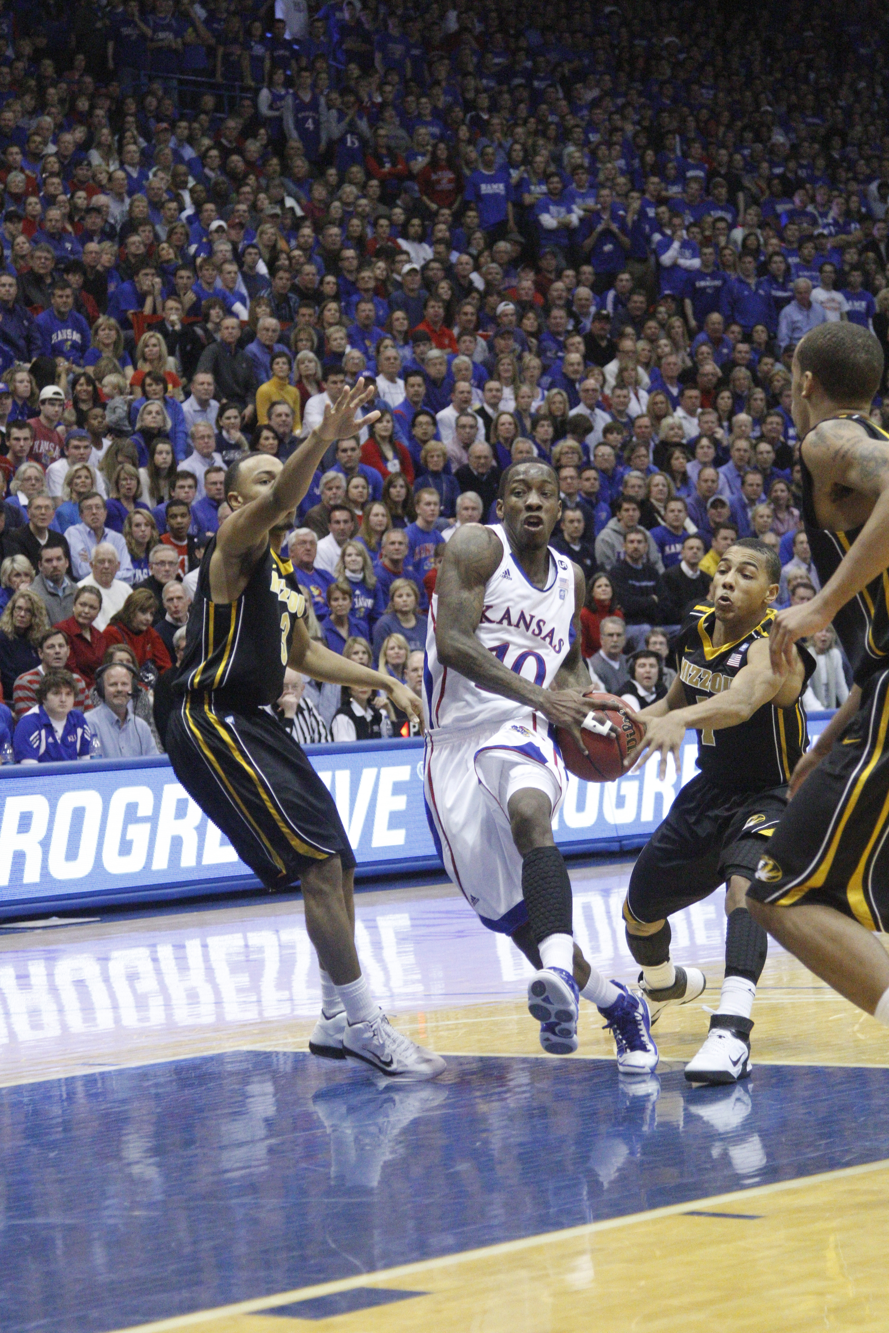 Kansas guard Tyshawn Taylor drives through the lane against the Missouri defense in the first half on Monday February 7, 2011 at Allen Fieldhouse.