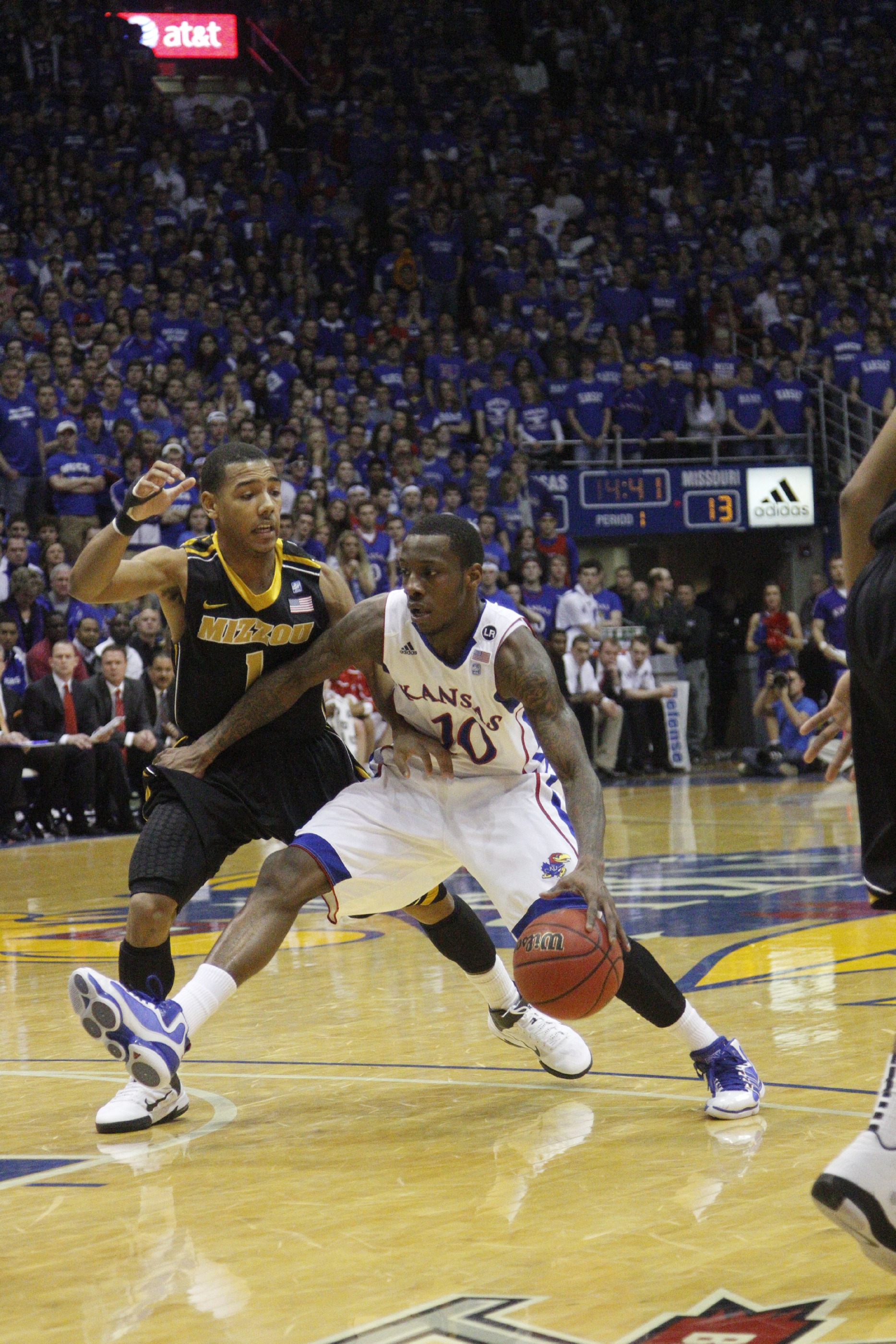 Kansas guard Tyshwan Taylor drives against Missouri's Phil Pressey on Monday, Feb. 7th, 2011 at Allen Fieldhouse.