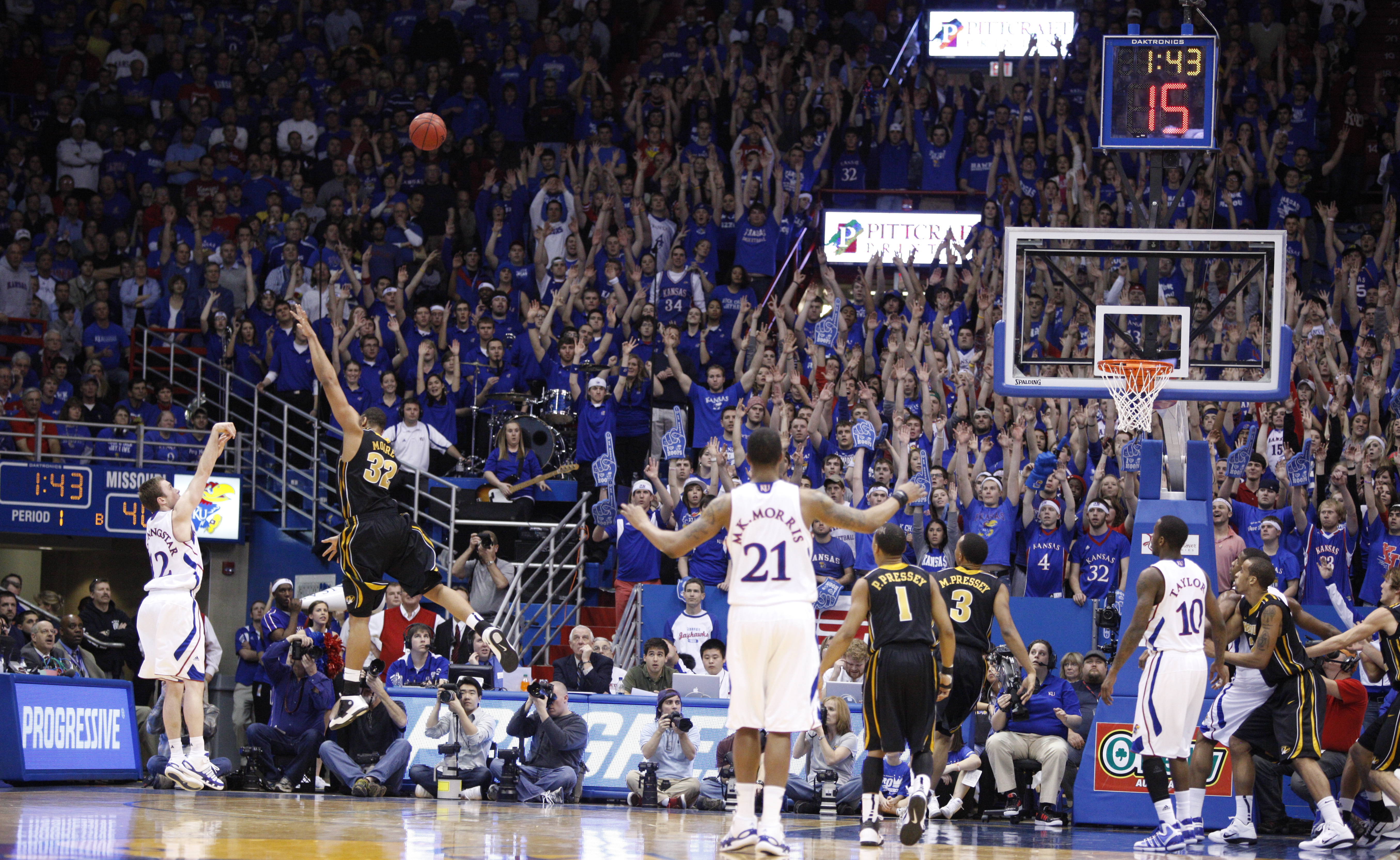 Kansas guard Brady Morningstar connects on a three-pointer from the corner over Missouri forward Steve Moore during the first half on Monday, Feb. 7, 2011 at Allen Fieldhouse.