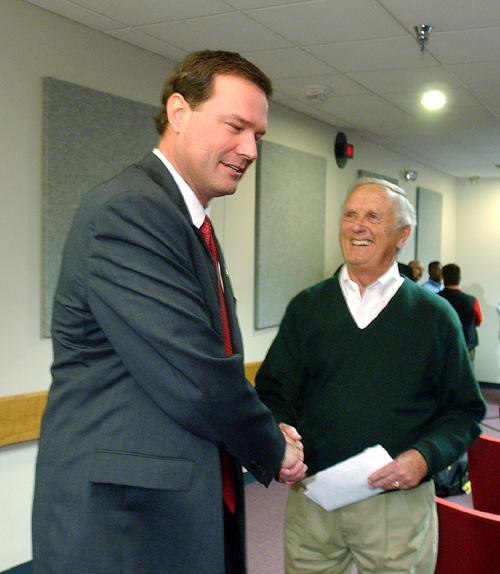 Newly appointed Kansas University men's basketball coach Bill Self, left, is congratulated by announcer Max Falkenstein after a news conference Monday at Hadl Auditorium.