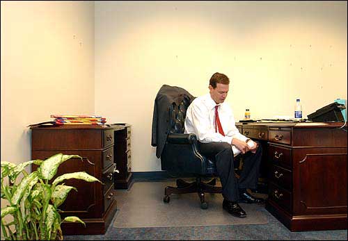 Greeted by an empty desk and blank walls, Bill Self opens a piece of mail in his new office. Self, who was hired as Kansas University's new men's basketball coach, moved Monday into Roy Williams' old office.