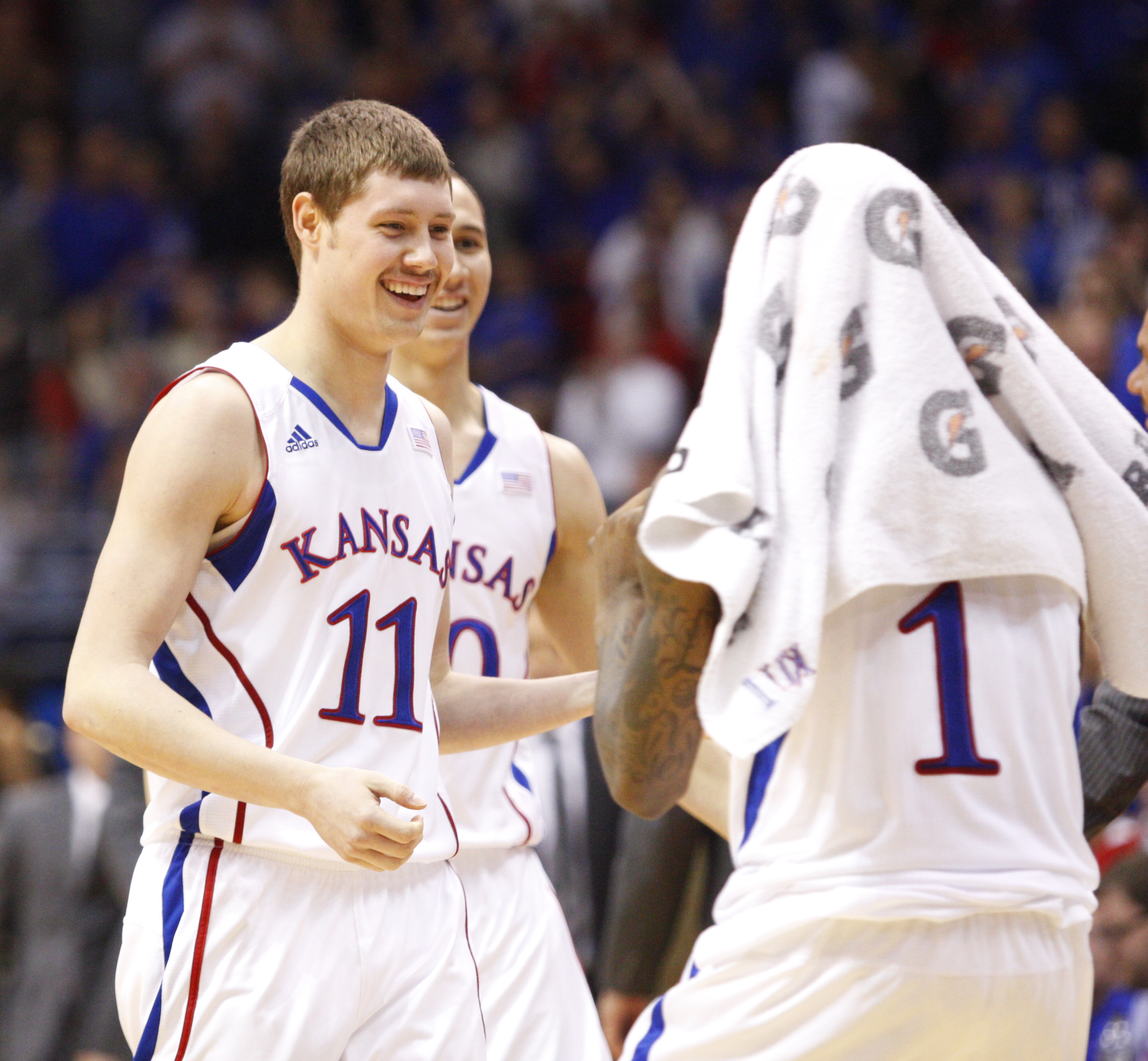 Kansas guard Tyler Self is congratulated by his teammates after a bucket against Colorado during the second half on Saturday, Dec. 8, 2012 at Allen Fieldhouse.