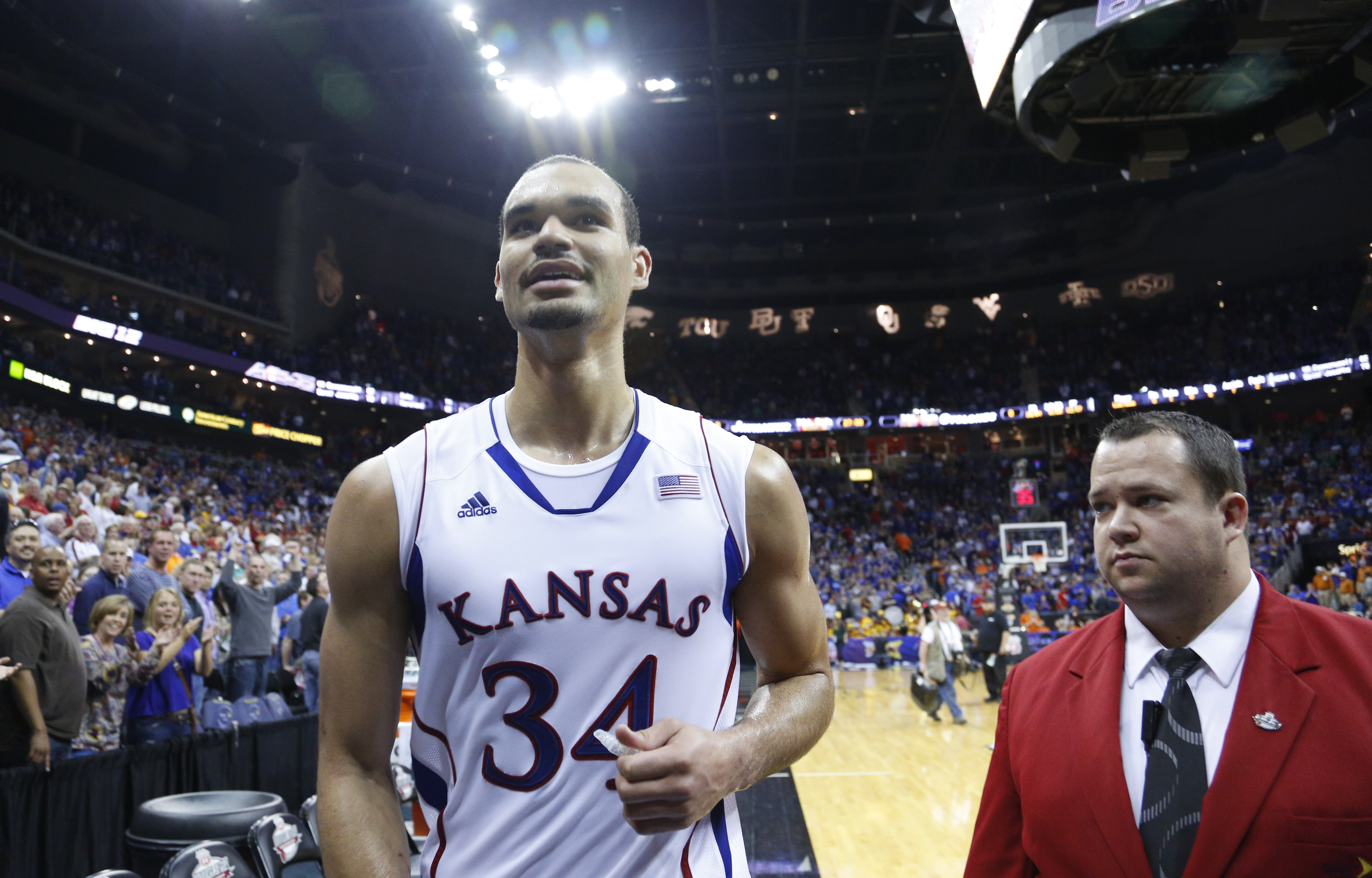Kansas forward Perry Ellis flashes a rare smile as he is applauded by the Kansas fans after leaving the court following the Jayhawks' 88-73 win over Iowa State in the semifinal round of the Big 12 tournament on Friday, March 15, 2013 at the Sprint Center in Kansas City, Missouri.