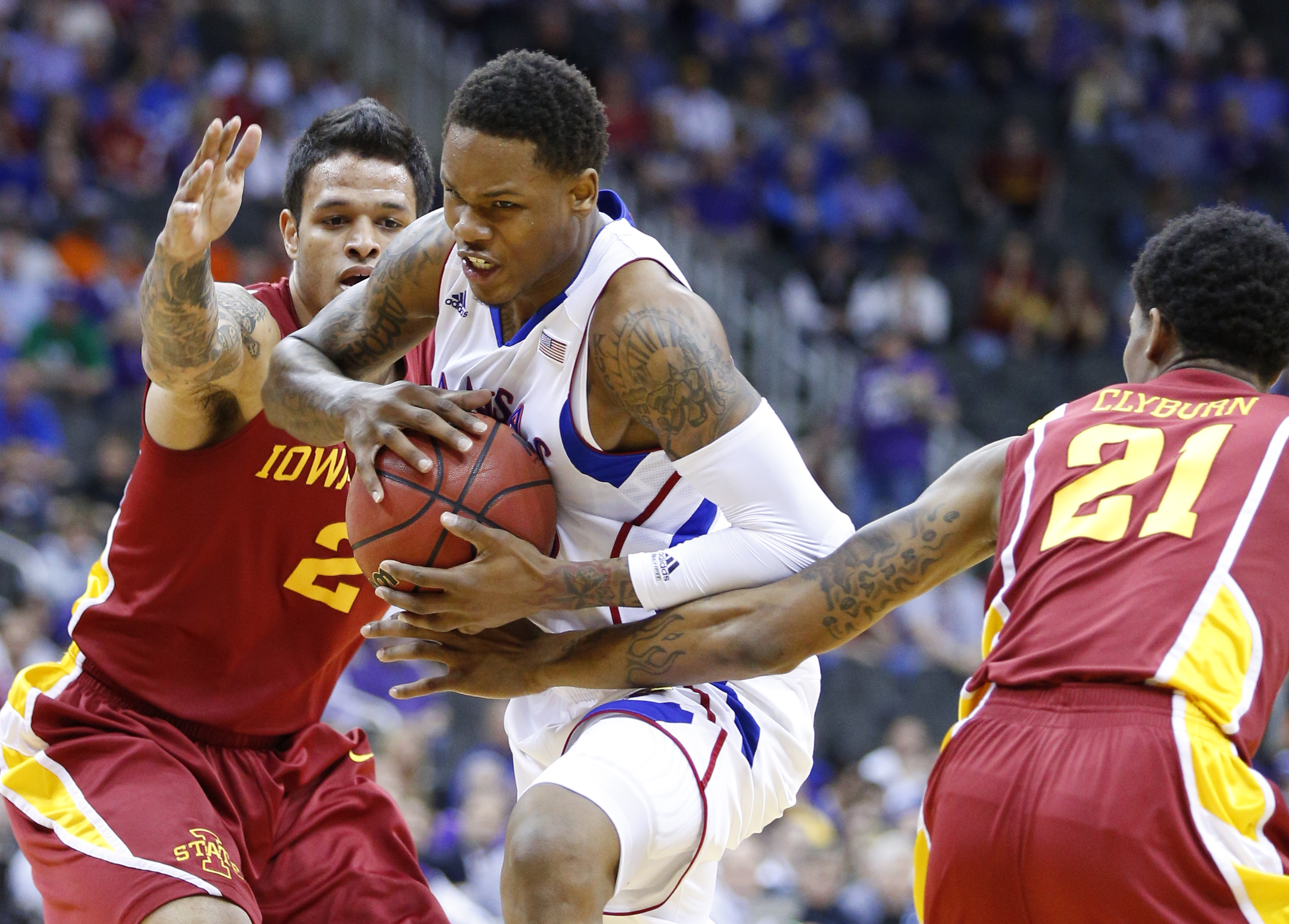 Kansas guard Ben McLemore drives between Iowa State defenders Chris Babb, left, and Willy Clyburn during the first half of the semifinal round of the Big 12 tournament on Friday, March 15, 2013 at the Sprint Center in Kansas City, Missouri.