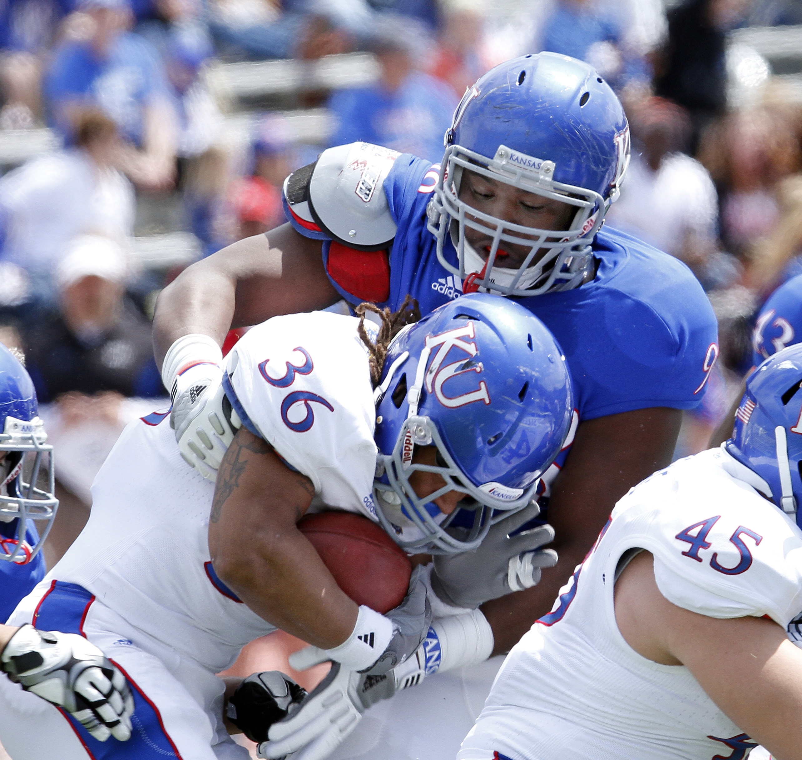 KU defensive lineman Keon Stowers, top, wraps up Taylor Cox during KU's Spring Game on Saturday, April 13, 2013.