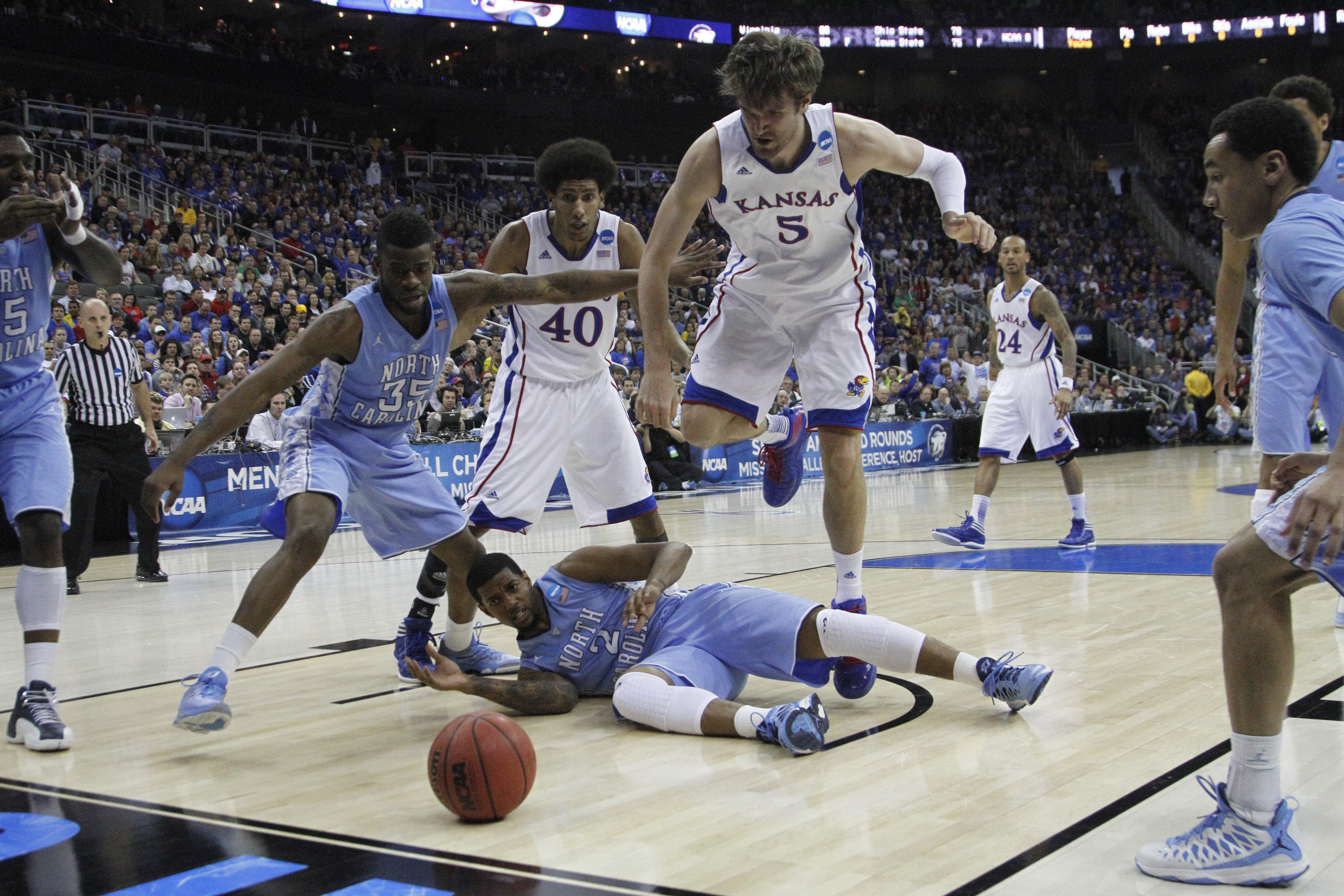 Kansas center Jeff Withey (5) jumps over North Carolina guard Leslie McDonald after a loose ball in the first half on Sunday, March 24, 2013 at the Sprint Center in Kansas City, Mo.