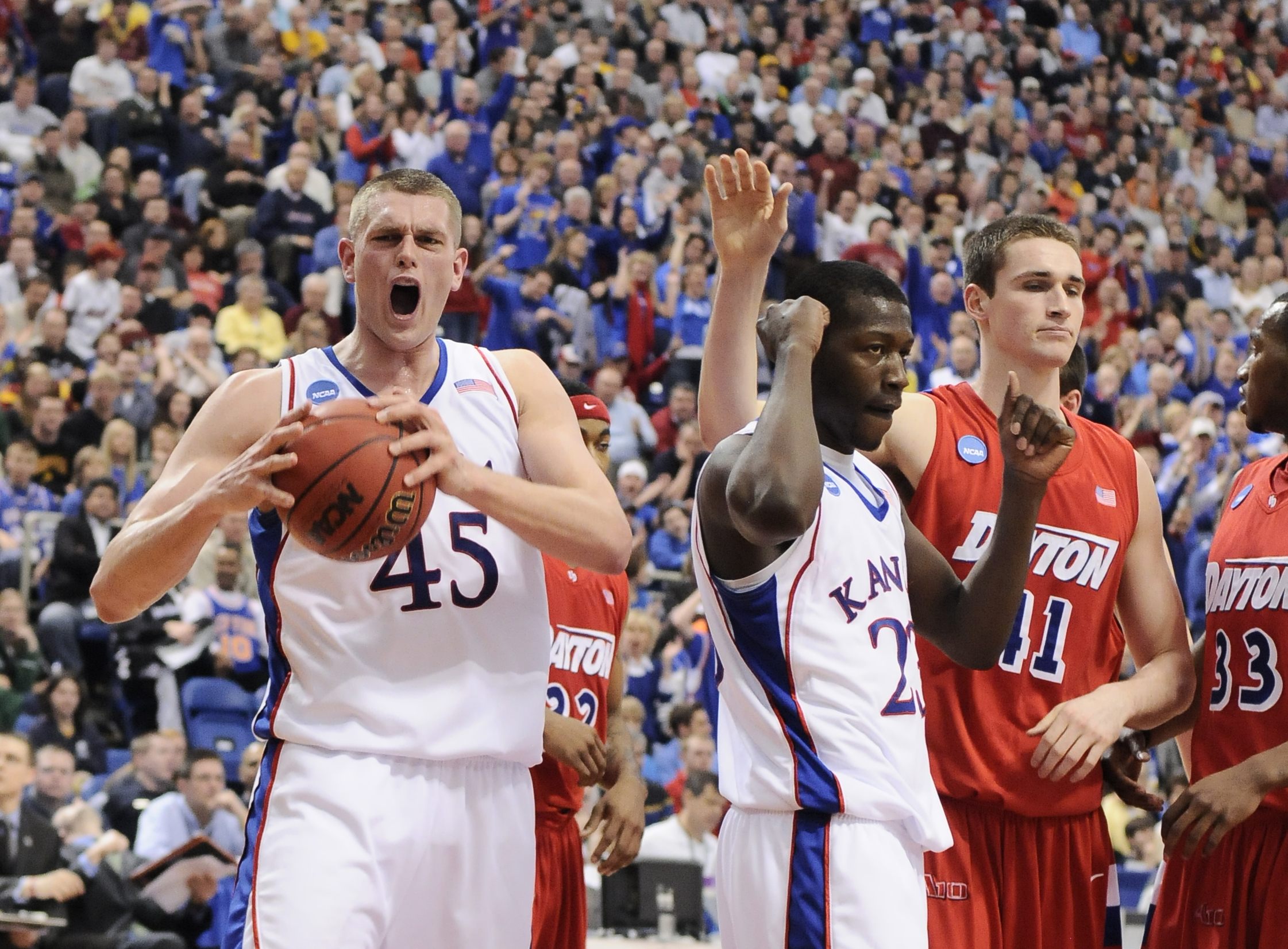 Kansas center Cole Aldrich screams in jubilation after getting a bucket and a foul Dayton during the first half Sunday March 22, 2009 at the Metrodome in Minneapolis. At right is Kansas forward Mario Little, Dayton center Kurt Huelsman and Dayton forward Chris Wright.