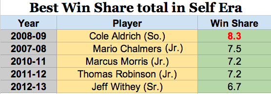 I referenced this in the ranking of KU’s centers under Self, but Aldrich’s sophomore season stands by itself in terms of Basketball-Reference’s all-encompassing Win Share statistic, which is “an estimate of the number of wins contributed by a player due to his offense and defense.”