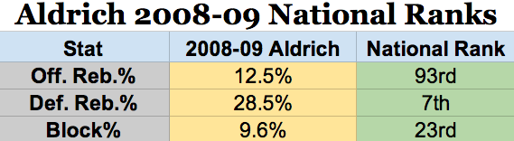 Big men also never seem to get credit for avoiding turnovers, but Aldrich was exceptional at this as well, as his 14.3-percent turnover rate was best on the team.