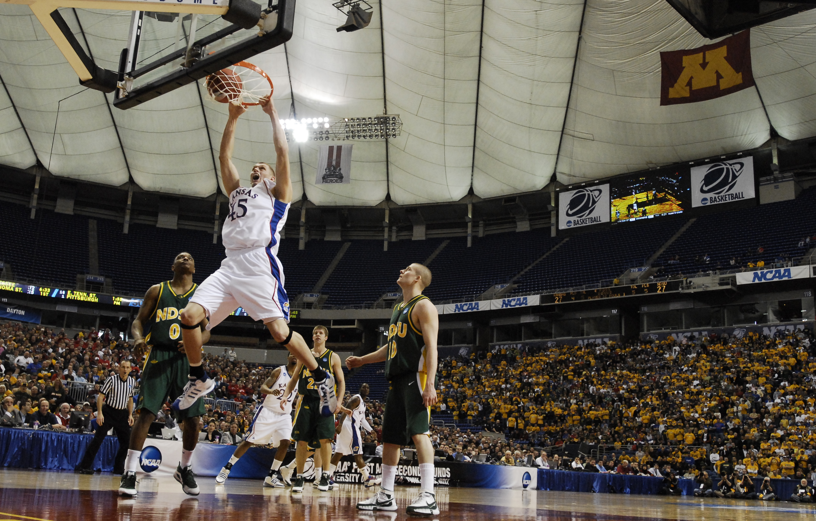 Kansas center Cole Aldrich delivers a dunk over North Dakota State defenders Dejaun Flowers, left, and Ben Woodside during the first half Friday, March 20, 2009 at the Metrodome in Minneapolis.