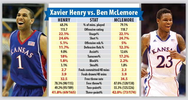• Playing time: McLemore’s per-game numbers look better because he was in a greater percentage of KU’s minutes. One could easily argue that if McLemore was on the deeper 2009-10 team in Henry’s place, his playing time might have been reduced as well.