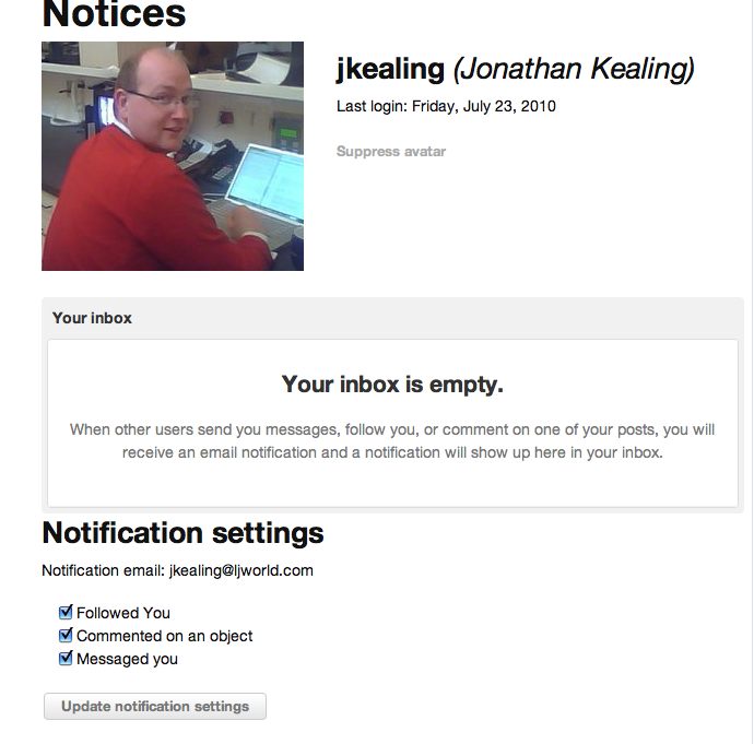 It’s easy, with the advent of the LJWorld.com Inbox. In addition to controlling your notification settings, you can also control whether private messages from other users go to your e-mail, or just stay in your LJWorld.com Inbox. You can also receive notices when a user “follows” you. At the moment, we don’t have following enabled on LJWorld.com, but intend to in the future.