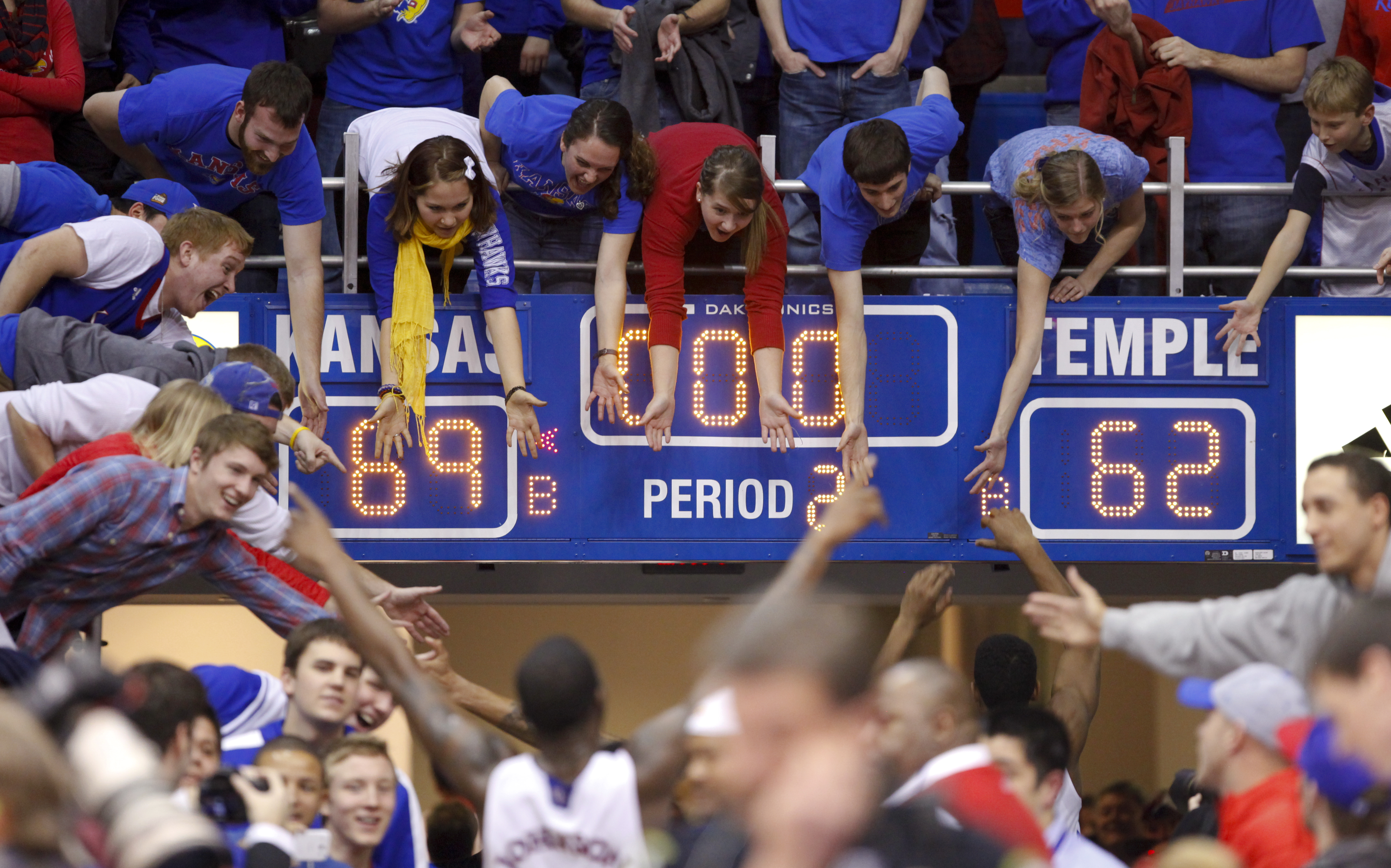Kansas fans reach below the scoreboard to slap hands with the Jayhawks after their 69-62 win over Temple on Sunday, Jan. 6, 2013 at Allen Fieldhouse.