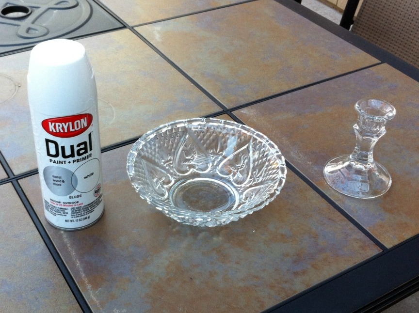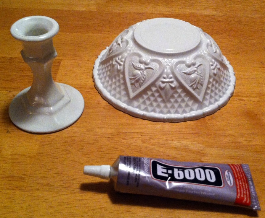 I used the same process for the bowl and candlestick, with the exception of spray painting both pieces in glossy white. I used Krylon primer and paint in one. (Note: I sprayed only the exterior of the bowl.) It took several light coats to get full coverage. Once the candlestick and bowl were dry, I attached the candlestick to the bowl with the E-6000 glue. Done.