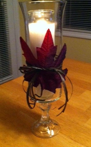 This is so easy — wash the glass pieces so there are no labels or sticky residue. I used E-6000 glue (purchased in Walmart’s craft section) to glue the candlestick to the glass vase. Let it set, placed a candle inside. At this point, I thought it looked kind of plain, so I took a fall leaf I had laying around and tied it to the exterior of the vase with some raffia. Much better.