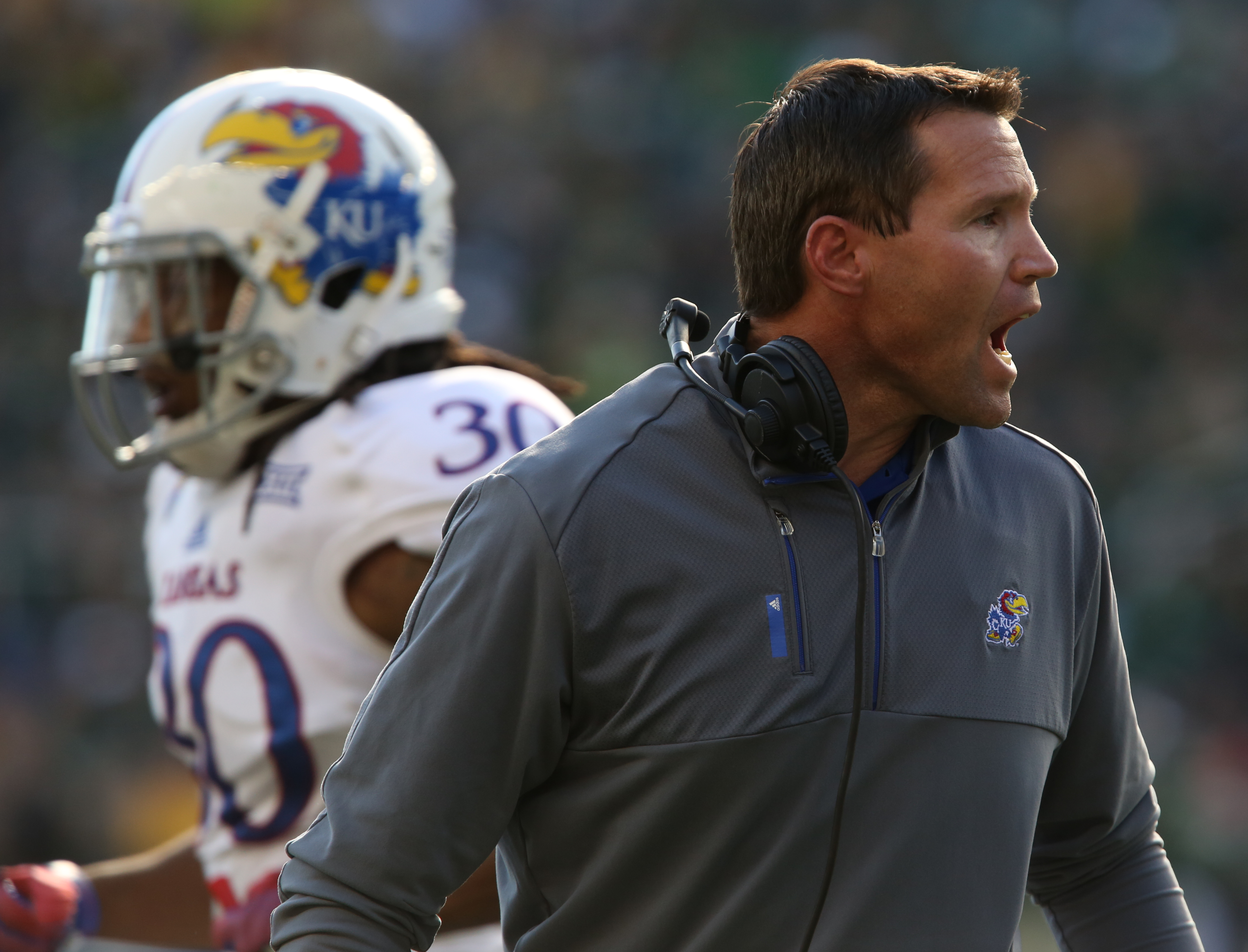 Kansas head coach Clint Bowen tries to keep his defense fired up after a Baylor score during the second quarter at McLane Stadium on Saturday, Nov. 1, 2014 in Waco, Texas.