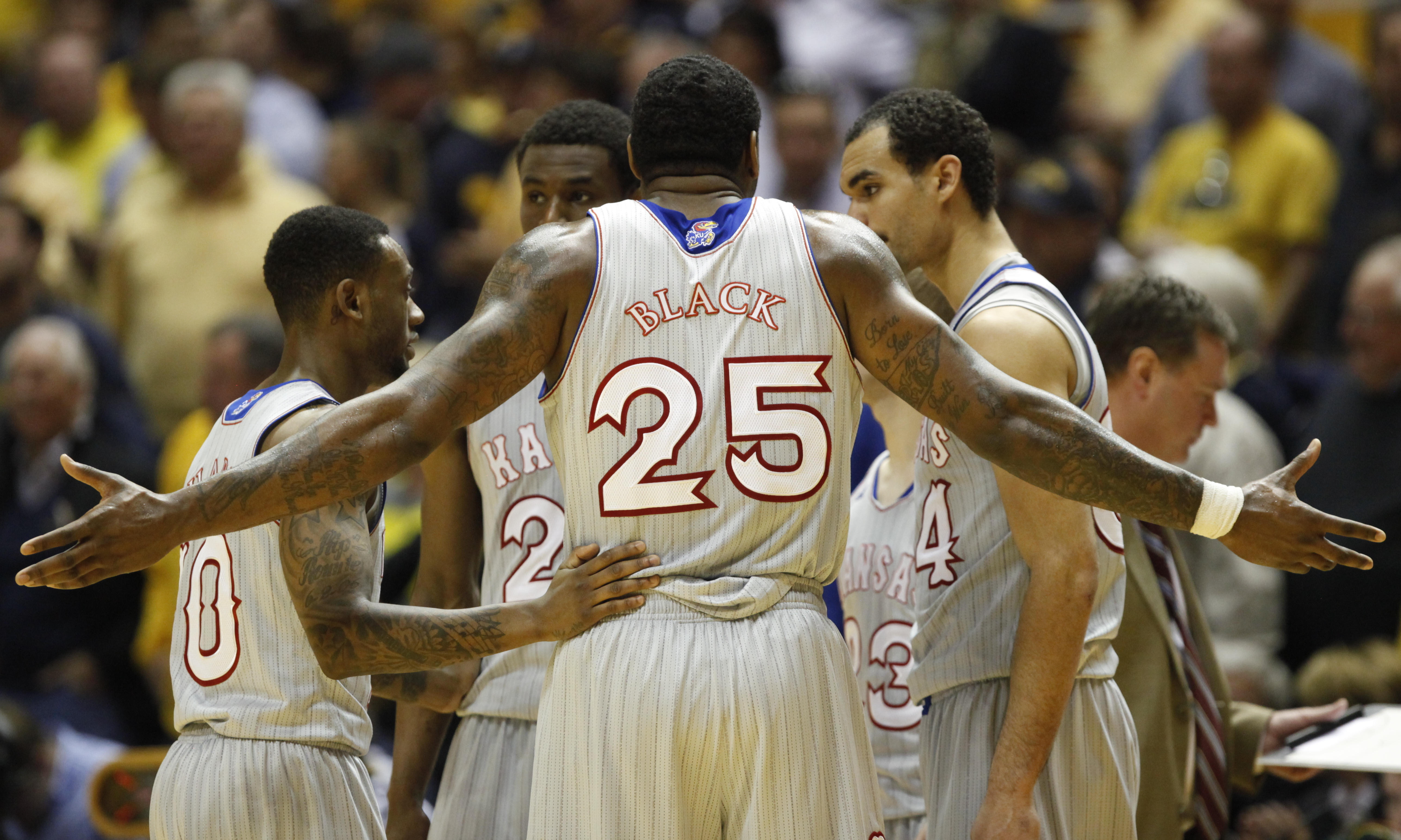 Kansas forward Tarik Black throws out his arms as the Jayhawks try to regroup in a huddle during a run by West Virginia in the second half on Saturday, March 8, 2014 at WVU Coliseum in Morgantown, West Virginia.