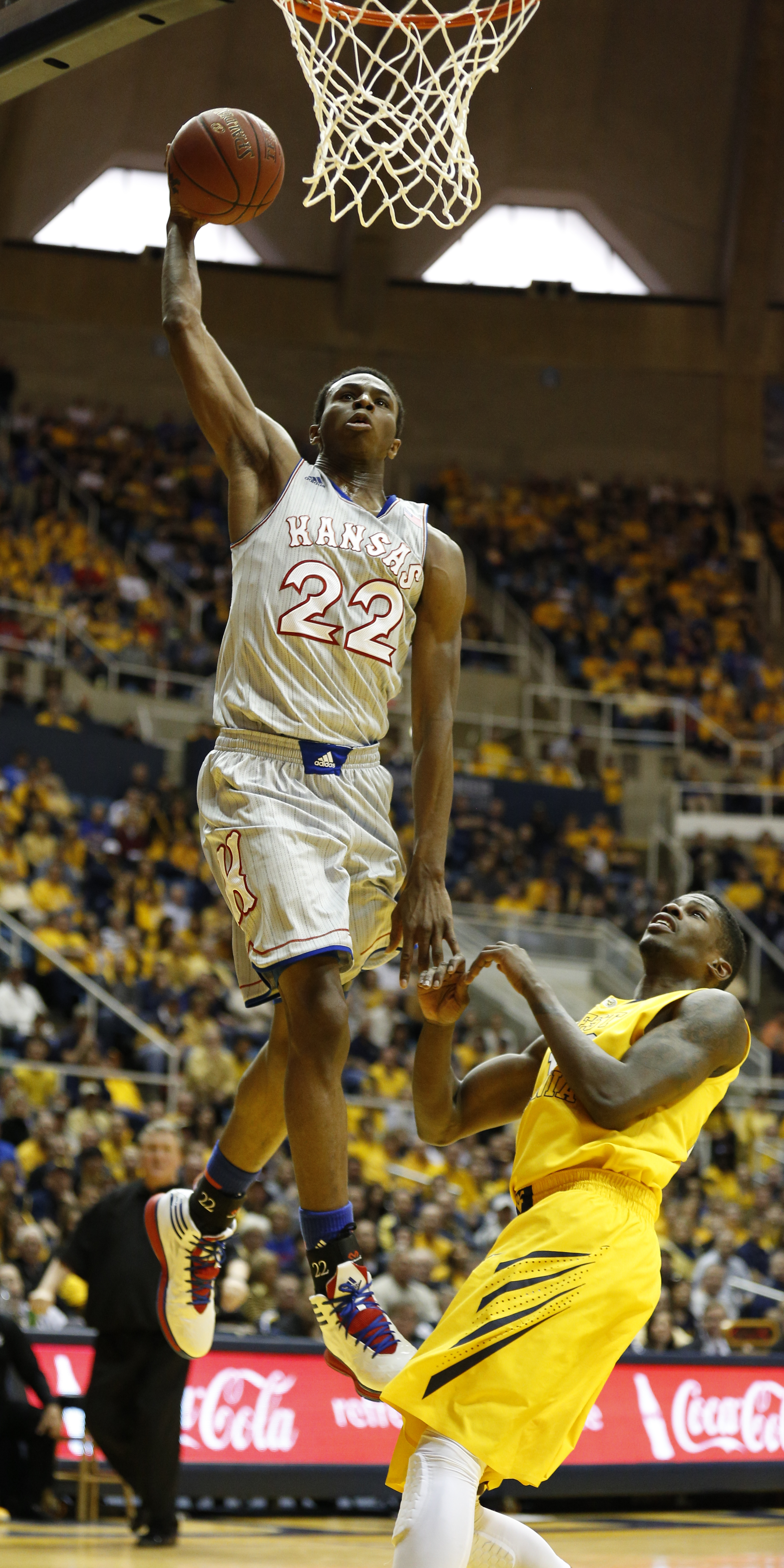 Kansas guard Andrew Wiggins elevates for a dunk over West Virginia guard Eron Harris during the first half on Saturday, March 8, 2014 at WVU Coliseum in Morgantown, West Virginia.
