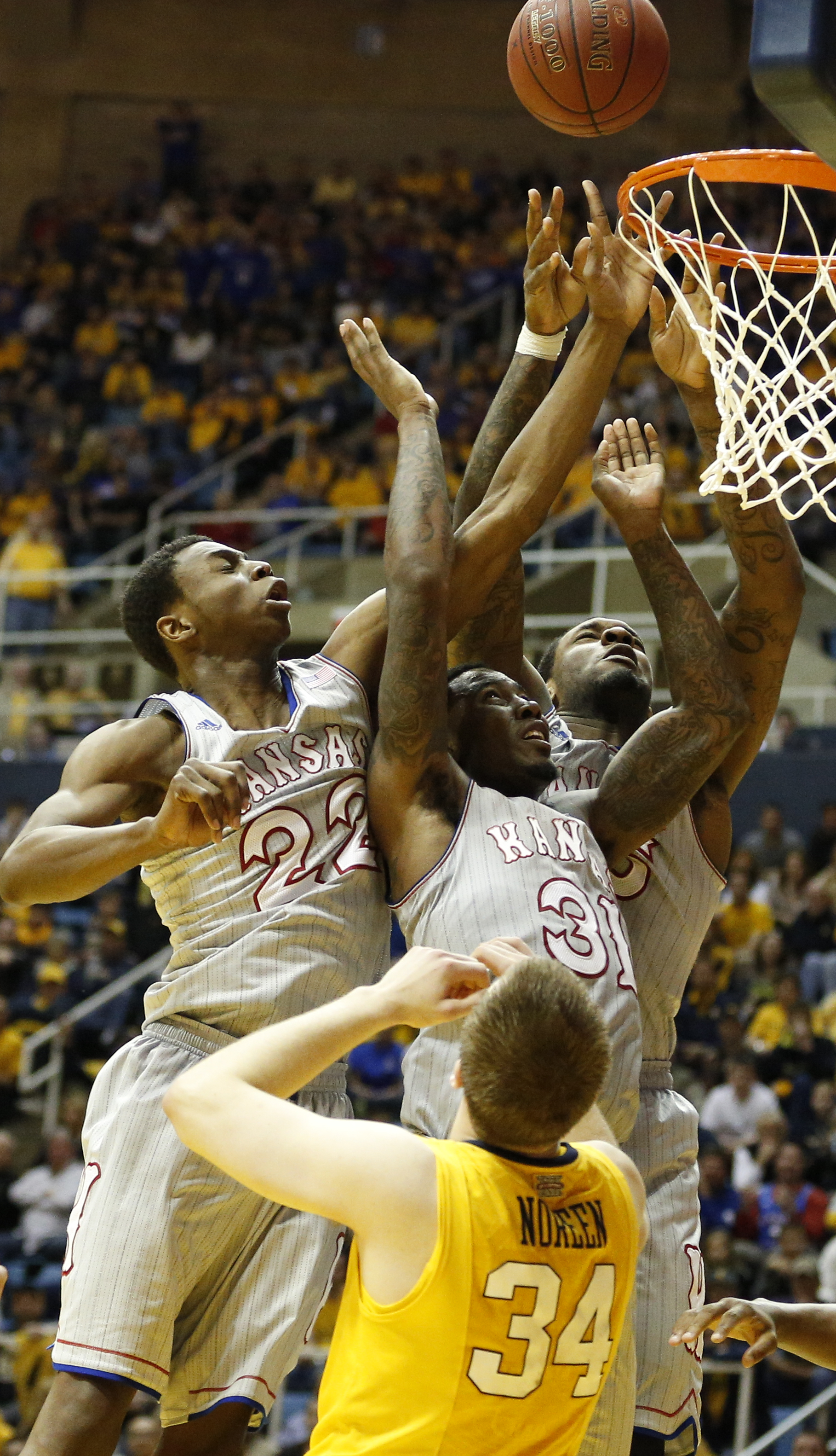 Kansas players Andrew Wiggins, left, Jamari Traylor and Tarik Black, go for a putback bucket over West Virginia forward Kevin Noreen during the second half on Saturday, March 8, 2014 at WVU Coliseum in Morgantown, West Virginia.