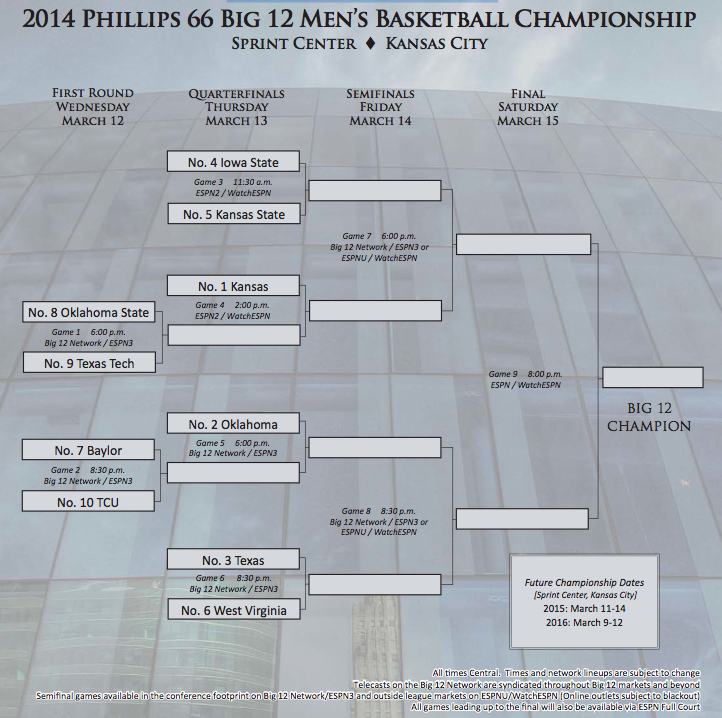 The Jayhawks will get some much-needed time off to watch film, regroup and get ready for the win-or-go-home portion of their schedule. Kansas will open play in the Big 12 Tournament in Kansas City, Mo., at 2 p.m. Thursday, when they face the winner of the Wednesday match-up between the No. 8 (Oklahoma State) and No. 9 seeds (Texas Tech).