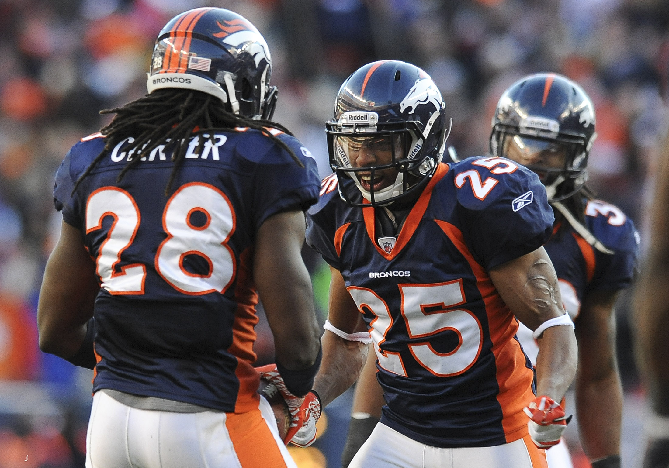 Denver Broncos strong safety Chris Harris (25) celebrates with free safety Quinton Carter after Carter intercepted a pass by Pittsburgh quarterback Ben Roethlisberger in the second quarter of their NFL wild-card playoff game Sunday in Denver. The Broncos won in overtime, leaving Harris — a Kansas University product — on one of just eight teams still alive.