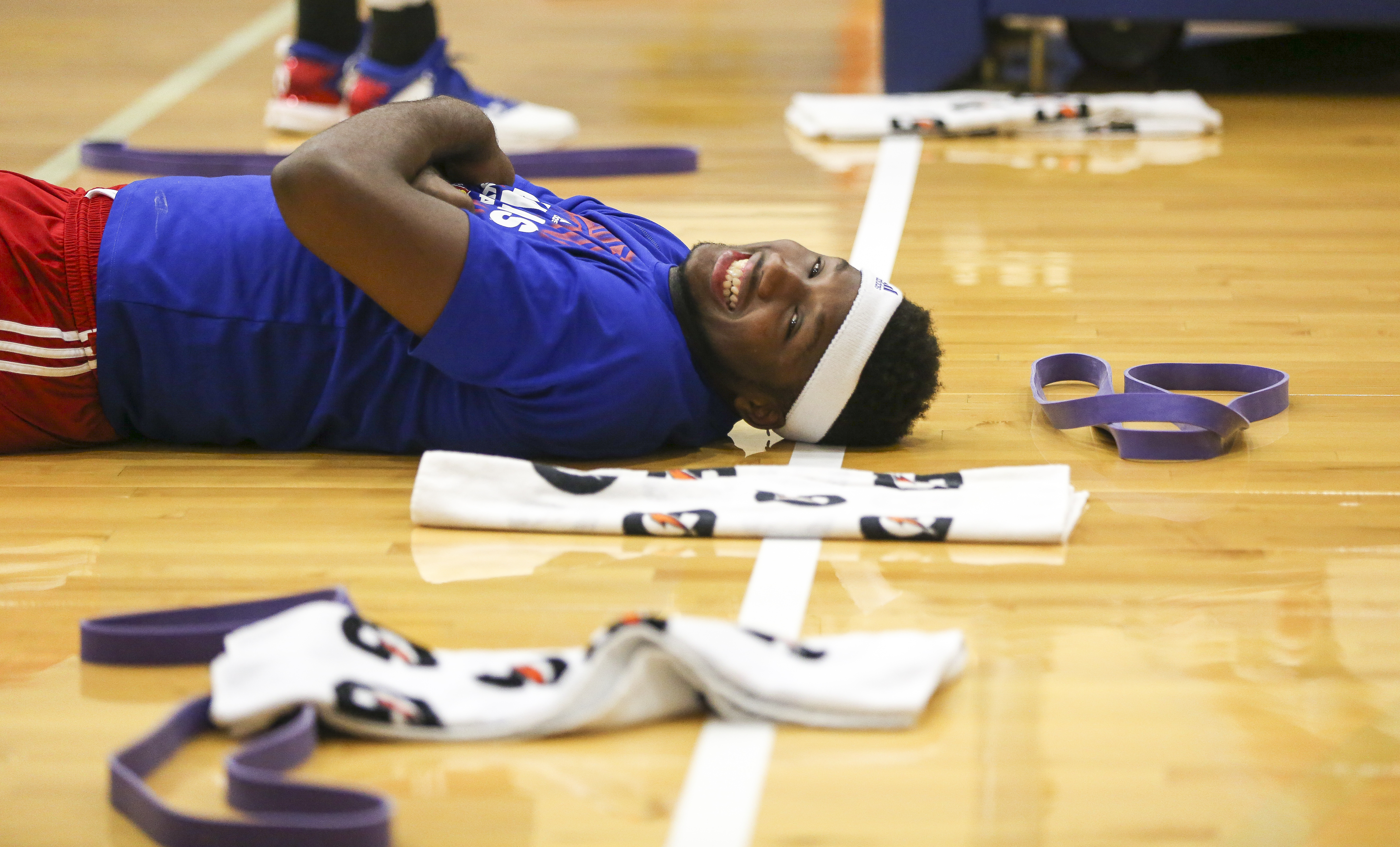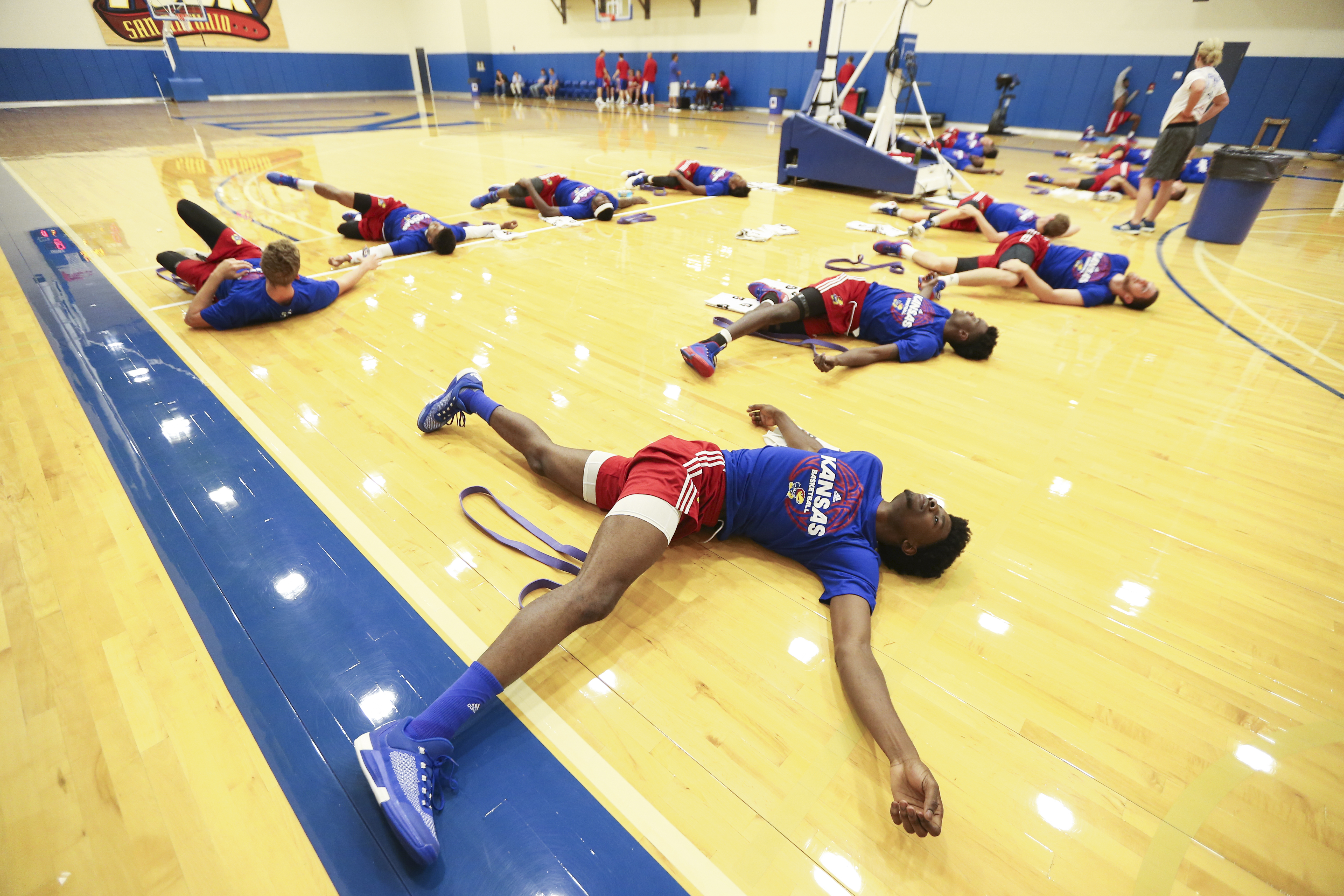 5:50 a.m. — The Jayhawks hit the floor for some pre-Boot Camp stretching. Strength coach Andrea Hudy leads while Self’s assistants and a slew of managers and trainers are on-hand, ready to help assist the players through the fifth session of this year’s Boot Camp. Given the early hour, it’s a little surprising to see so many smiles and so much energy this early, but that seems, as much as anything, to be proof of the fact that making it through one of Self’s Boot Camps is as much about what your mind will allow as it is what your body can endure.