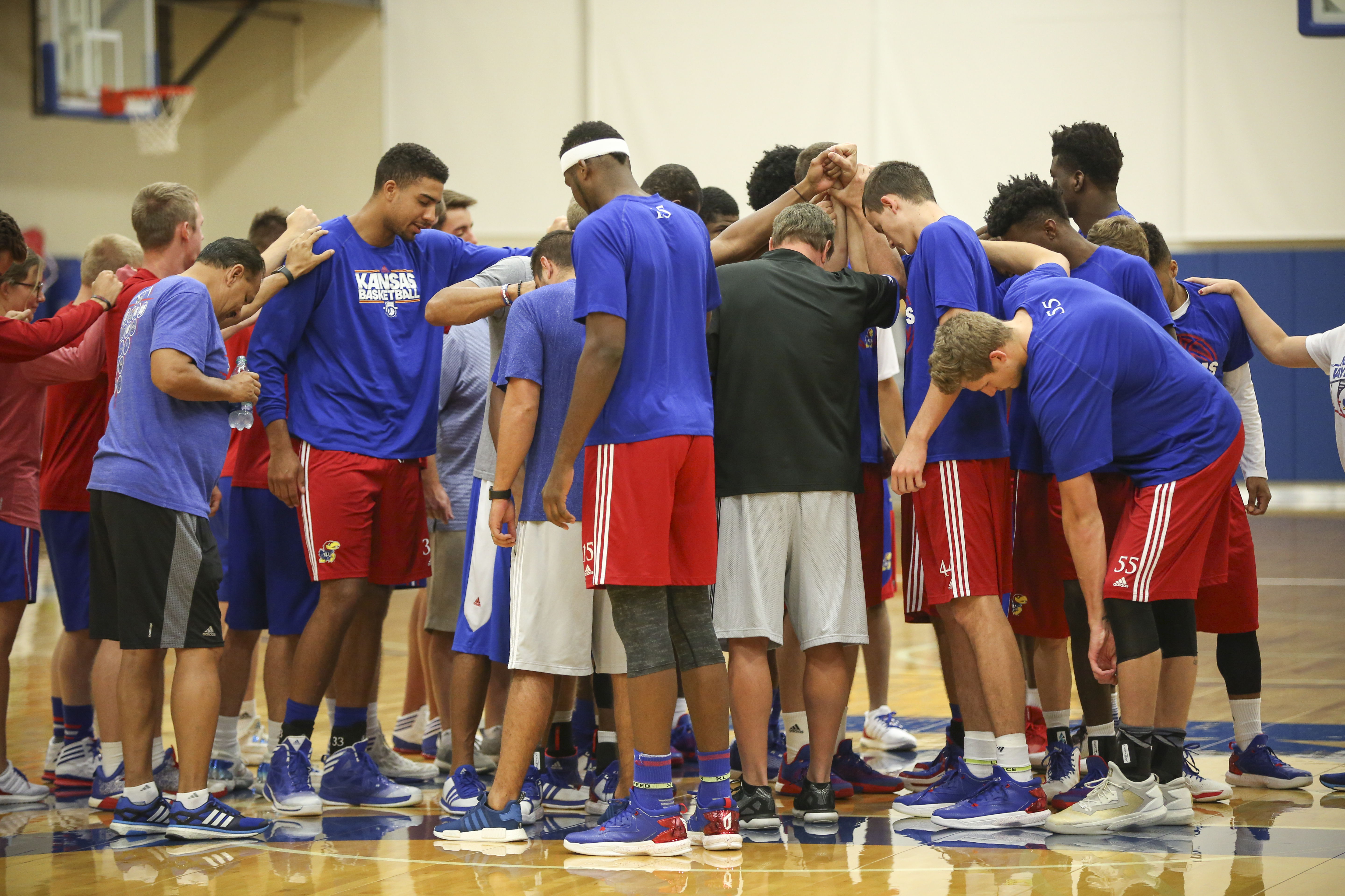 The Jayhawks come together at center court before the start of their fifth day of Boot Camp in the practice gym on Friday, Sept. 23, 2016 just after 6 a.m.