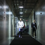 Kansas guard Devonte' Graham heads down a hallway to the team locker room during a day of practices and press conferences on Thursday, March 22, 2018 at CenturyLink Center in Omaha, Neb.