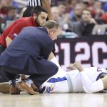 Kansas guard Quentin Grimes (5) is visited by trainers as he lies on the floor with a cramp during the second half, Friday, March 15, 2019 at Sprint Center in Kansas City, Mo.